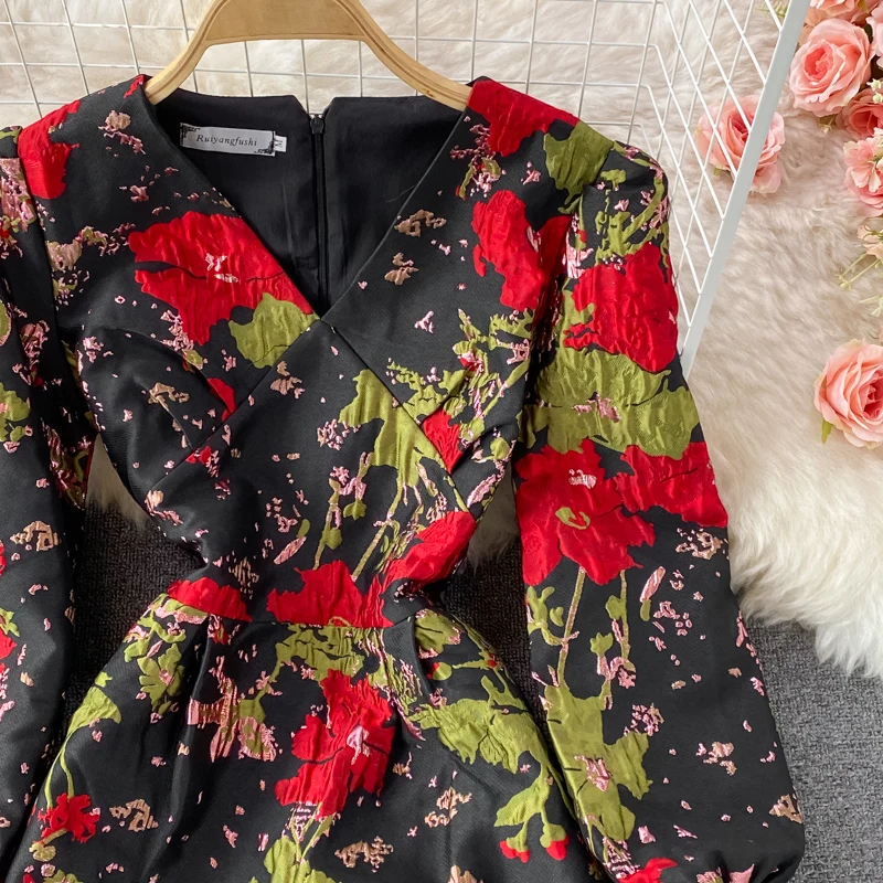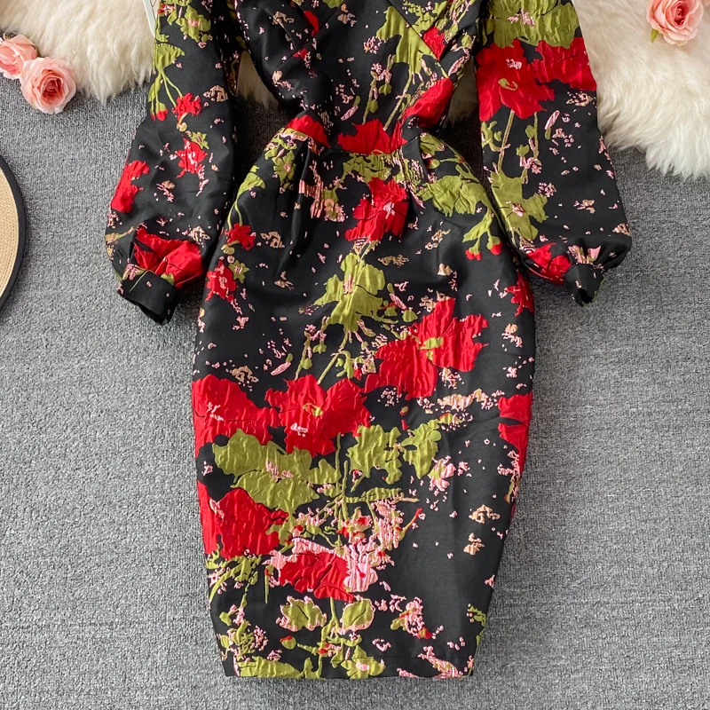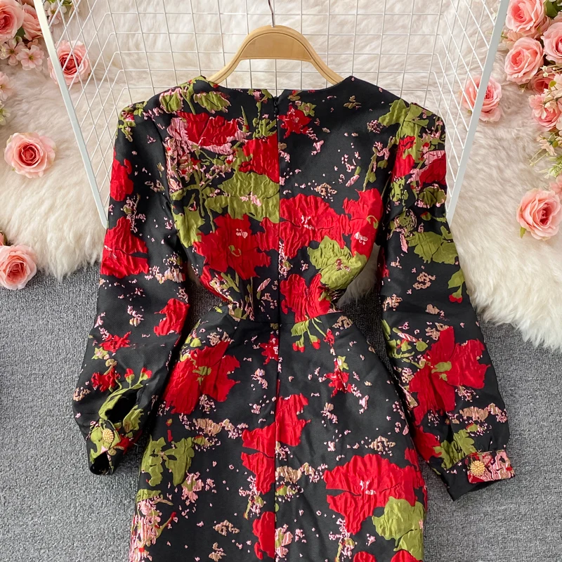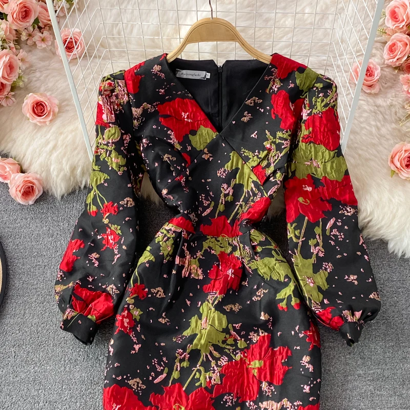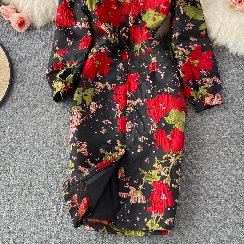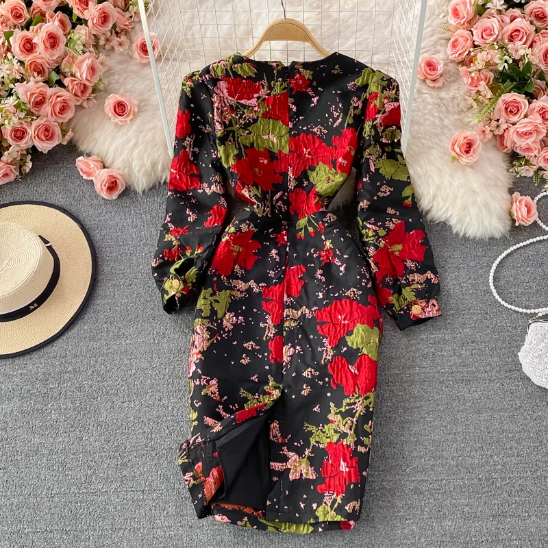 New Fall Vintage Jacquard Office Work Dress Women V-neck Puff Sleeve Print Slim Fit Slit Party Bodycon Designer Dresses