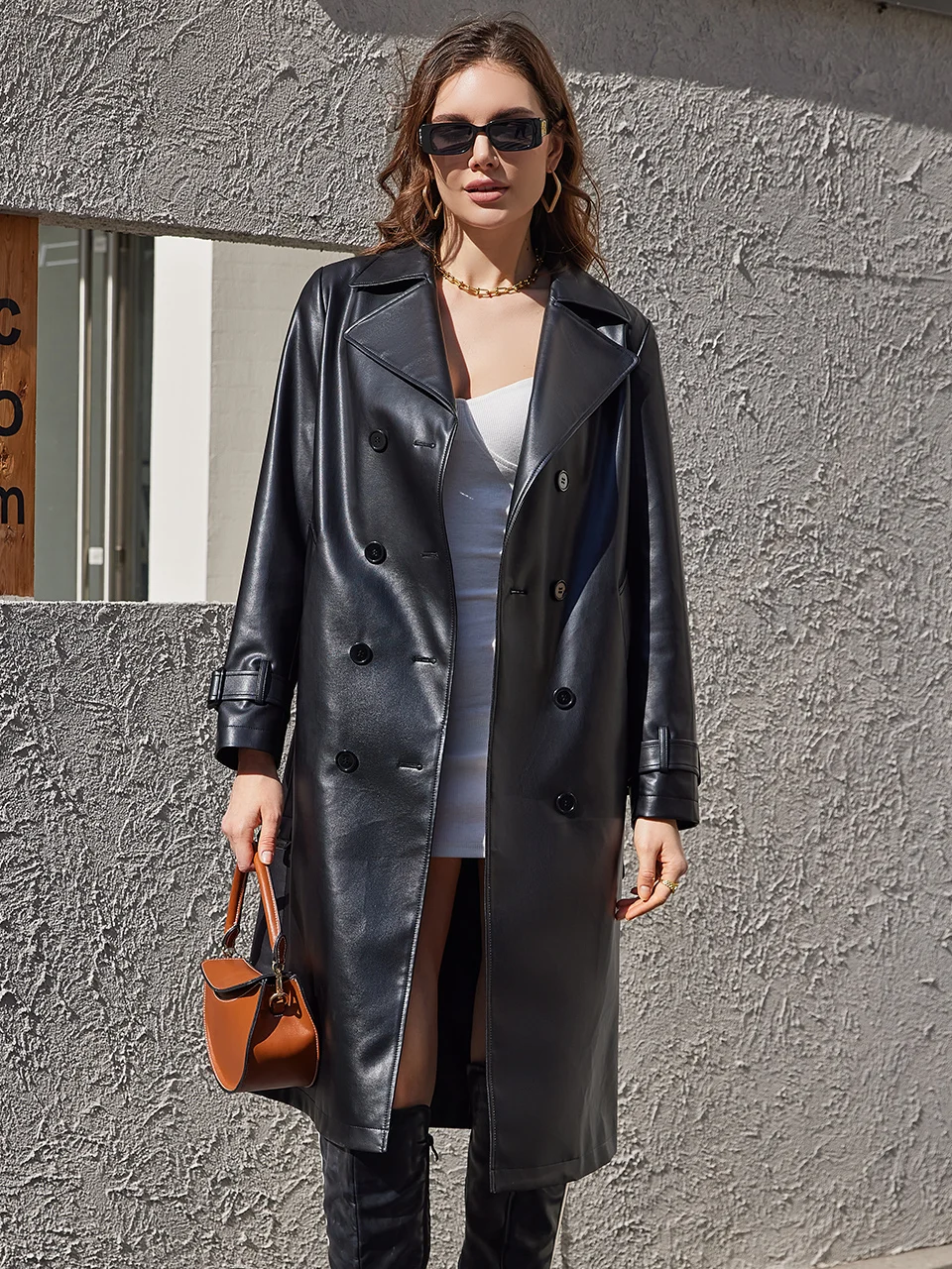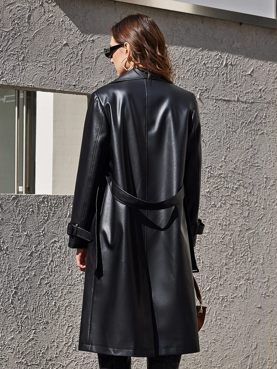 Extra Long Oversized Black Faux Leather Trench Coat for Women Belt Double Breasted Loose Fashion PU Coat 30020