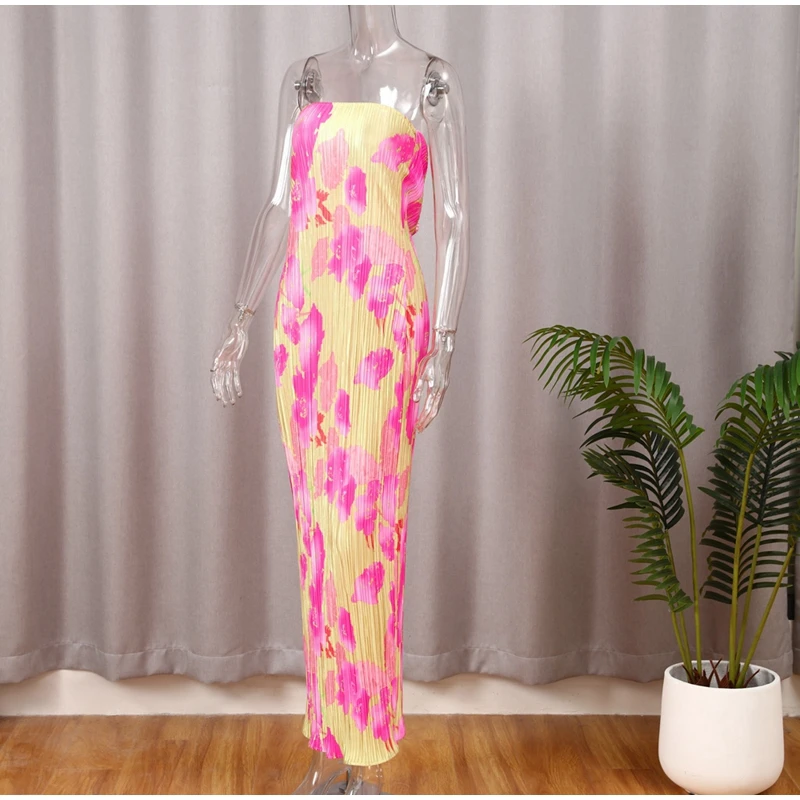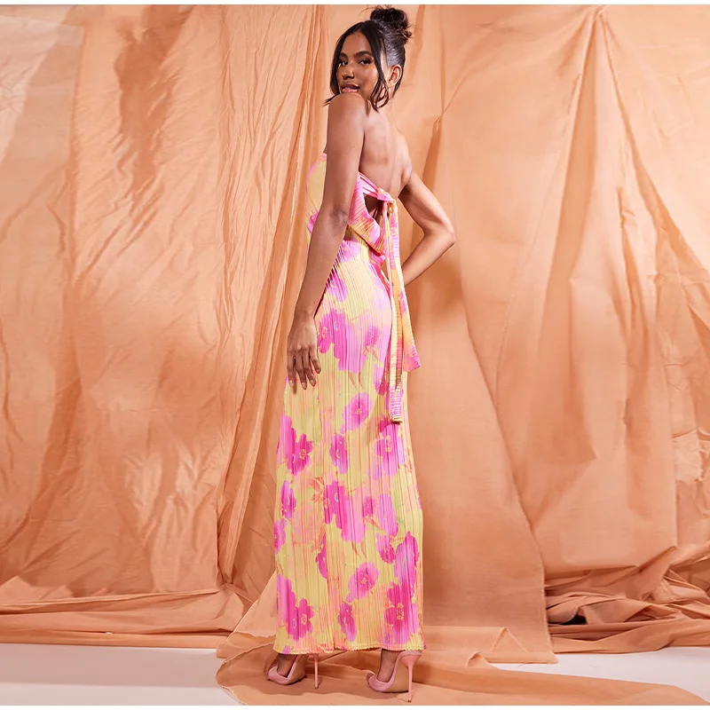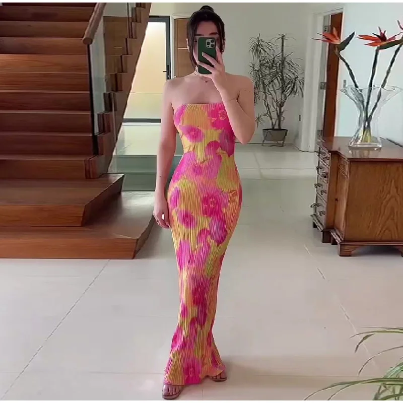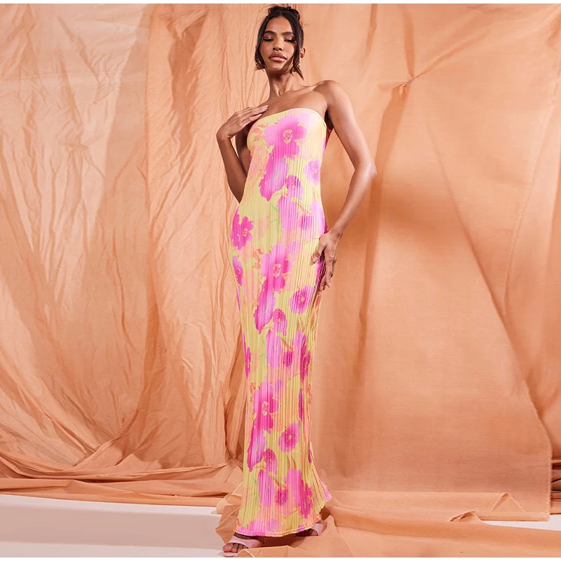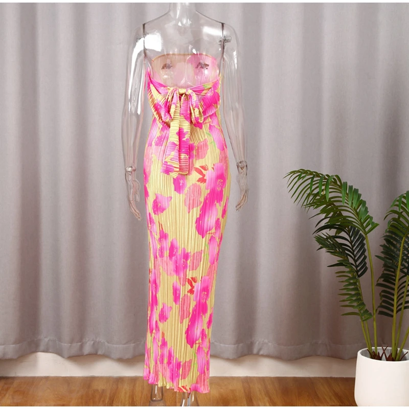 New Strapless Printed Pleated Slim Fit Long Dress Women Summer Backless Bow Lace Up Maxi Vestidos Banquet Evening Gown Dresses