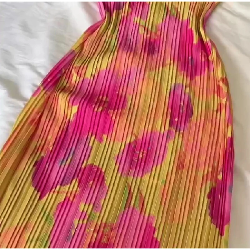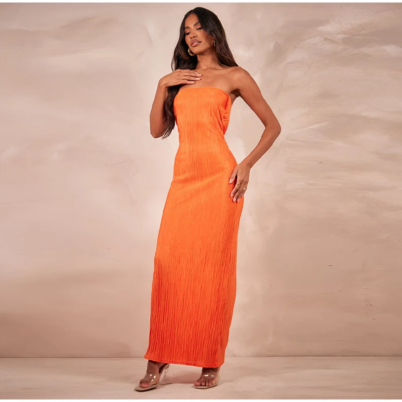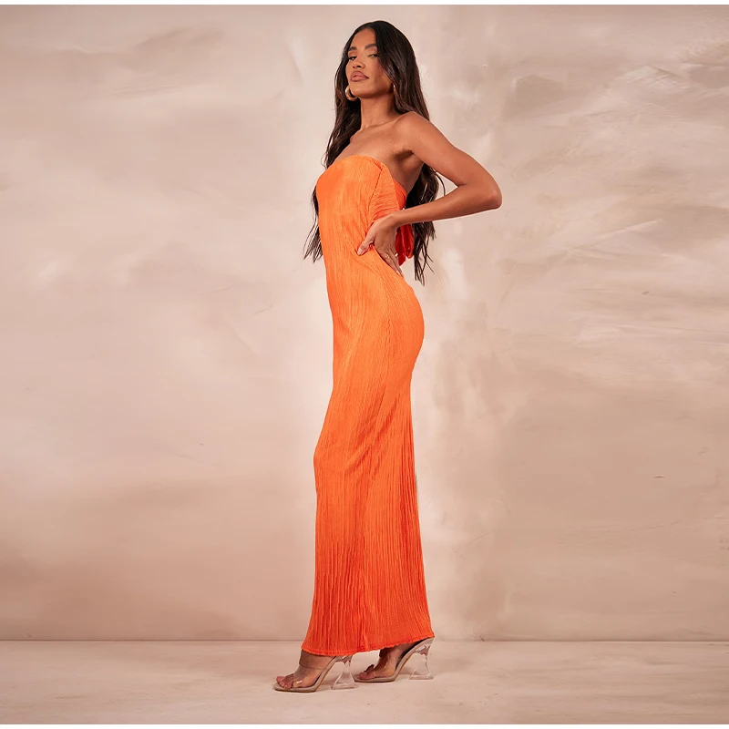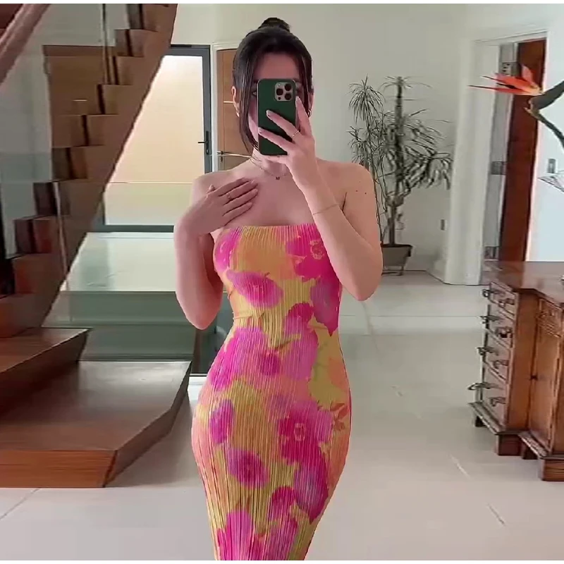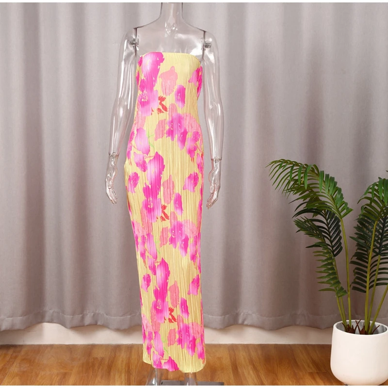 New Strapless Printed Pleated Slim Fit Long Dress Women Summer Backless Bow Lace Up Maxi Vestidos Banquet Evening Gown Dresses