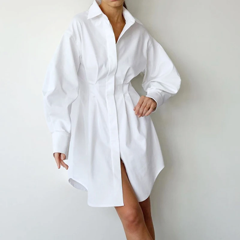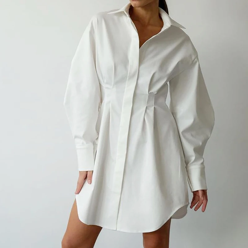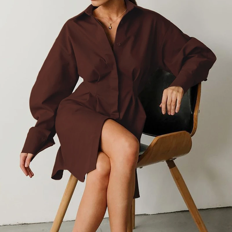Office Women Simple Solid Long Sleeved Dresses Spring Temperament Slim Shirt Dress Fashion Single Breasted Pleated A-line Dress