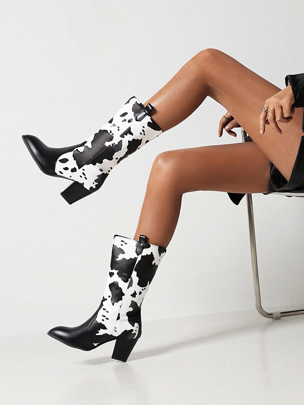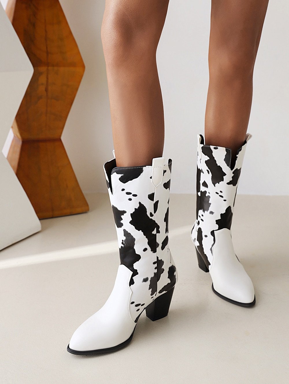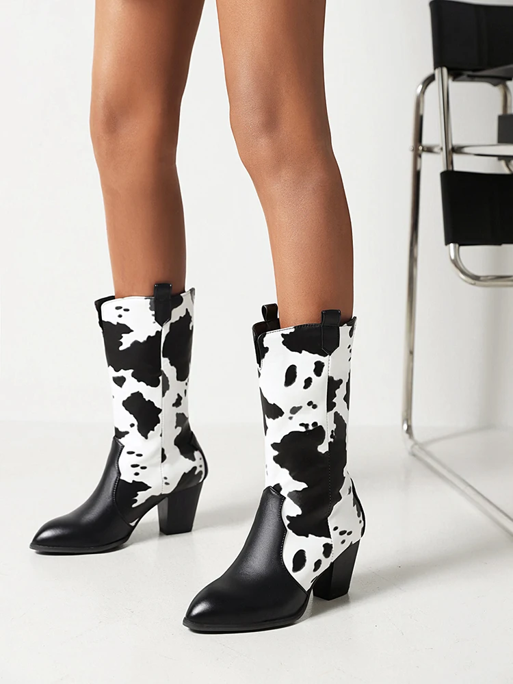 Oversized Cow Pattern Pointed Toe Thick Heel Mid-Pipe Boots Plush Lining Chimney Style Slip-On Women’s Chelsea Boots
