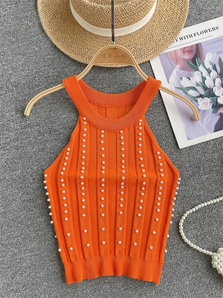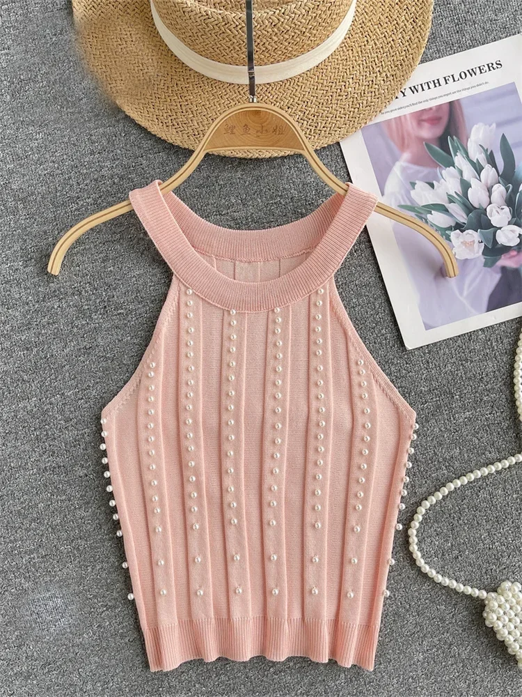 Pearls Women Tops Strapless Backless Slim Fit Senior Korean Style Fashion Streetwear Mini Knitted Tank
