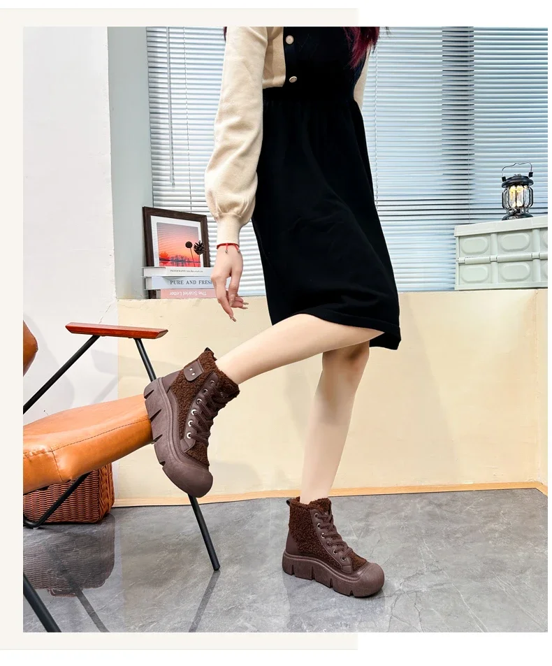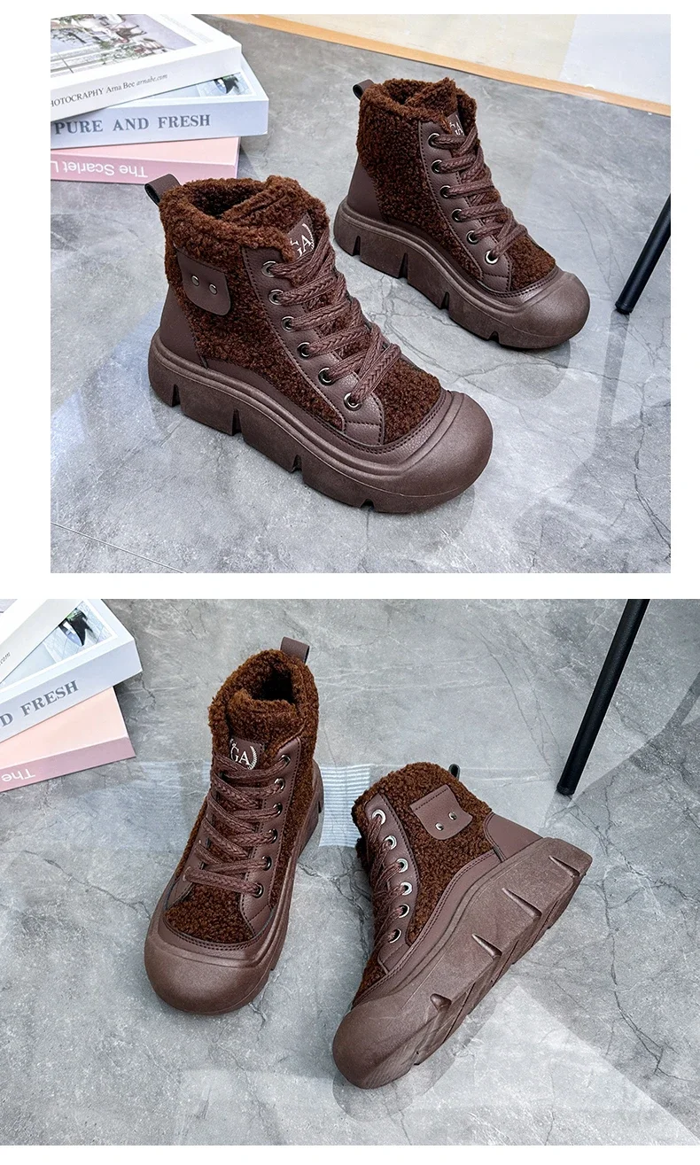Platform Non-slip Fashion Women’s Boot Platform Black Lace-up 2024 Winter Warm Round Toe Ankle Boots Zapatos De Mujer