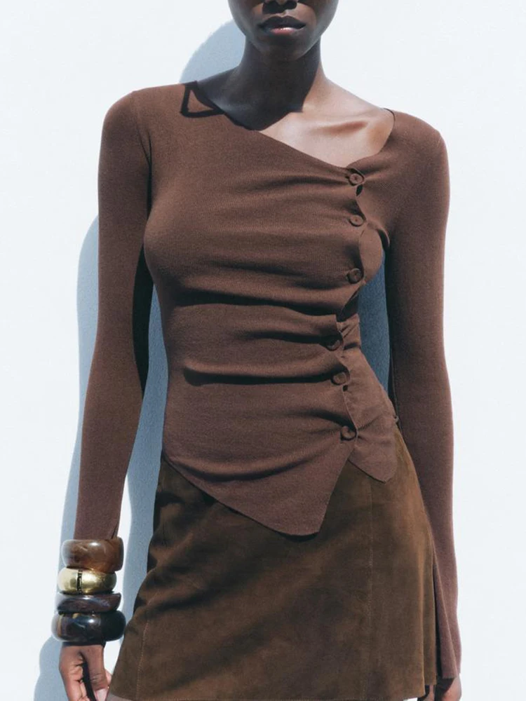 Solid Spliced Folds Designer T Shirt For Women Skew Collar Long Sleeve Patchwork Buttons Chic T Shirts Female New