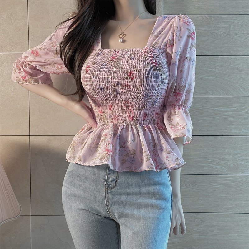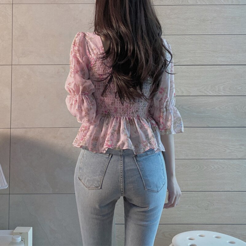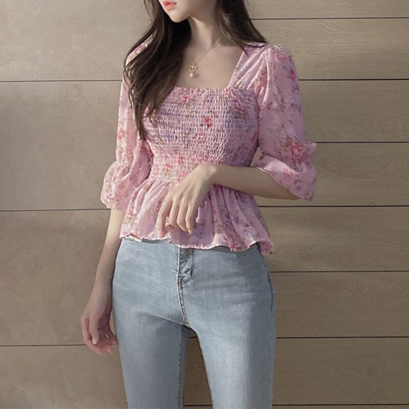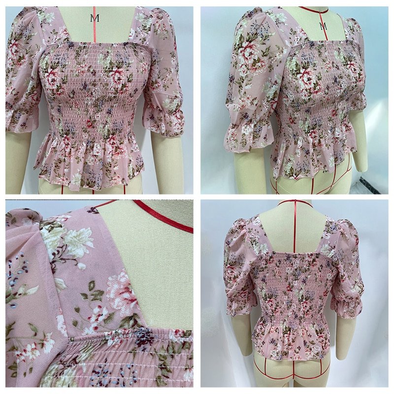 Spring Summer Women Blouse Female Chiffon Pullover Shirts Tops Flower Print Square Neck Puff Sleeve Ruffle Top Casual Blouses