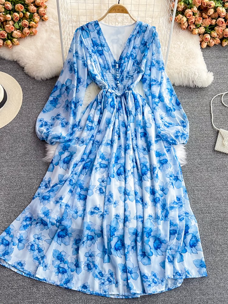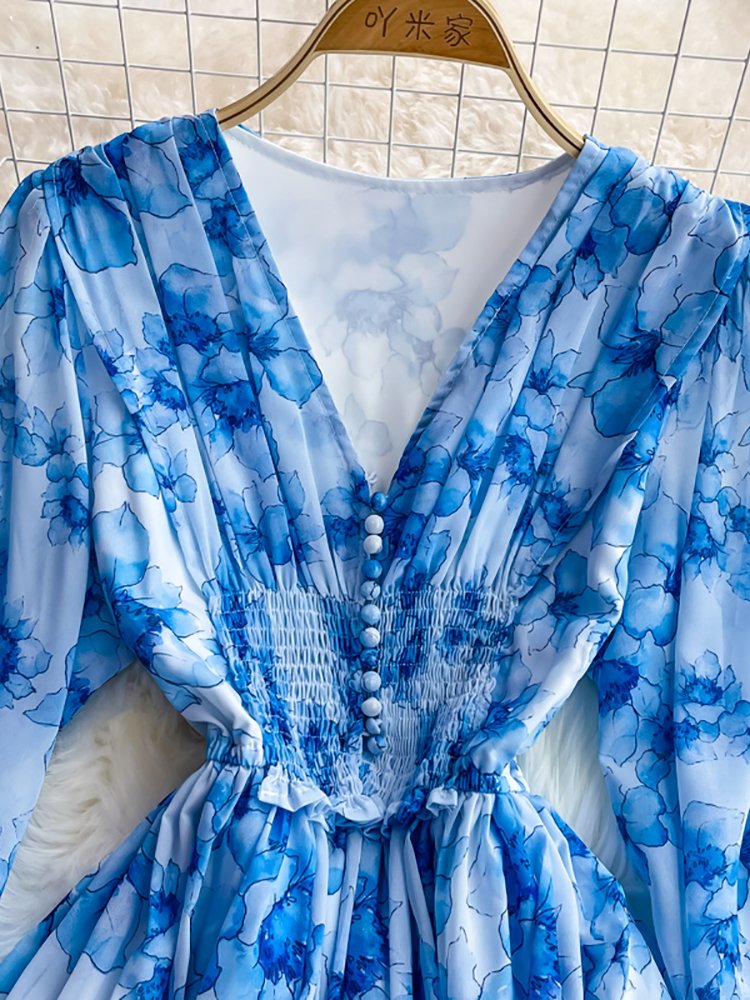 Spring Women Blue Floral Printed Midi Dress Bohemian Vacation Beach Robe Female Elegant A-Line Vestidos