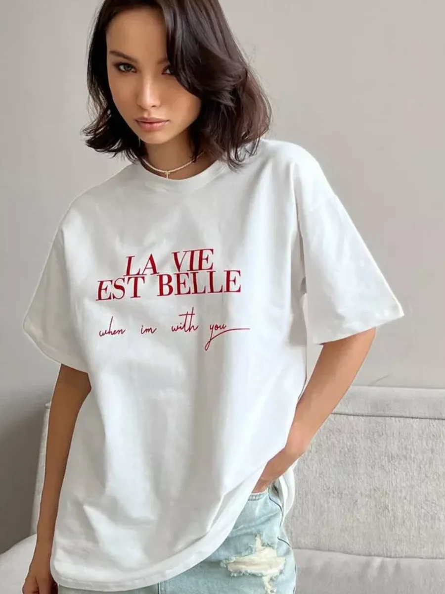 Be the first to review “Summer American Ins Mid-length Temperament Printed T-shirt Street Personality Women’s Letters Versatile Cotton Short-sleeved Top”