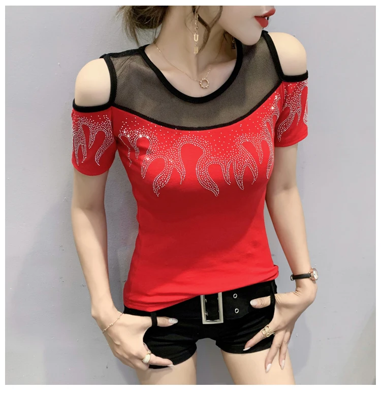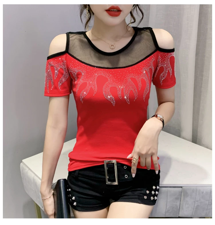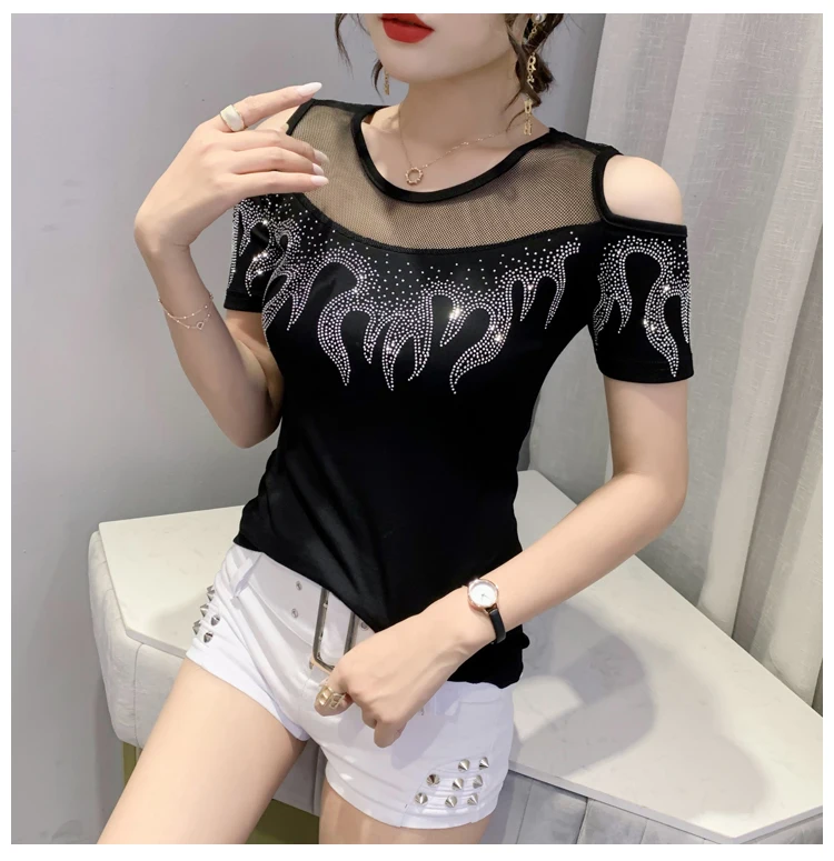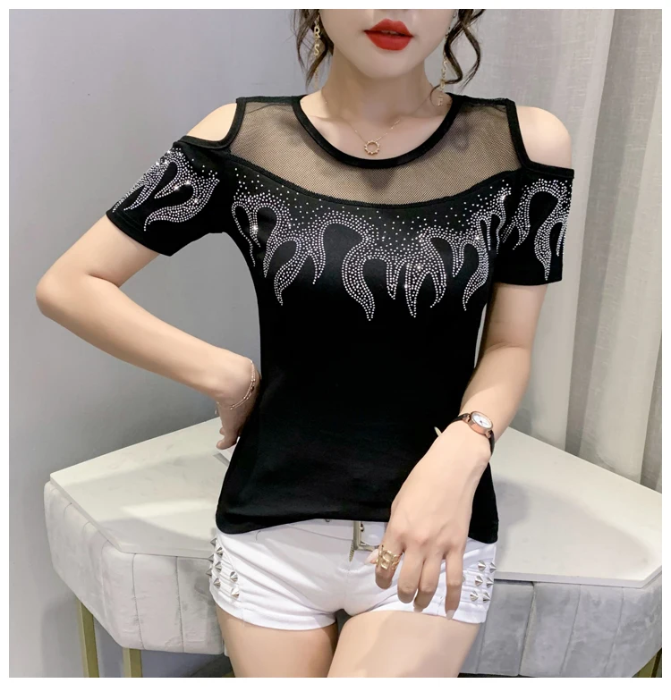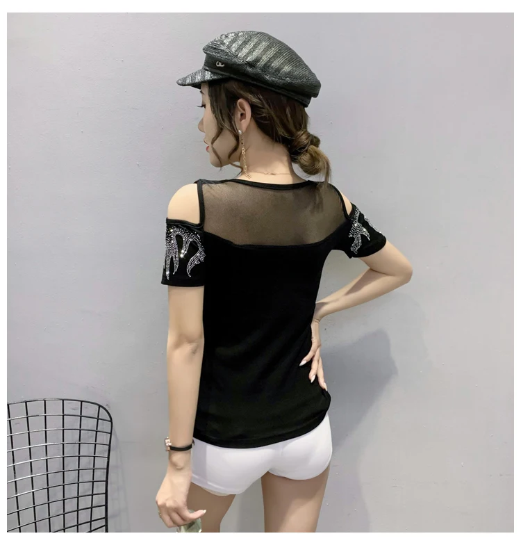Summer European Clothes T-Shirt Chic Off Shoulder Shiny Diamonds Spliced Women Tops Sexy Back Short Sleeve Tees