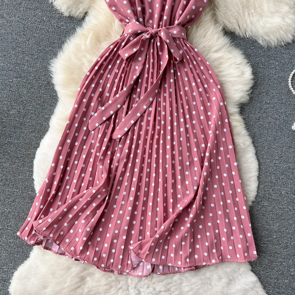 Summer Gentle Style French Retro Polka Dot Dress Sleeveless Lace Up Slim Waist Thin Vestido Sweet Pleated Femme Robe