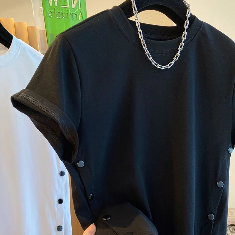 Summer New Button Split O-neck T-shirts Y2k Short Sleeve Loose Tee Shirt Fashion High Waist White Tops Women