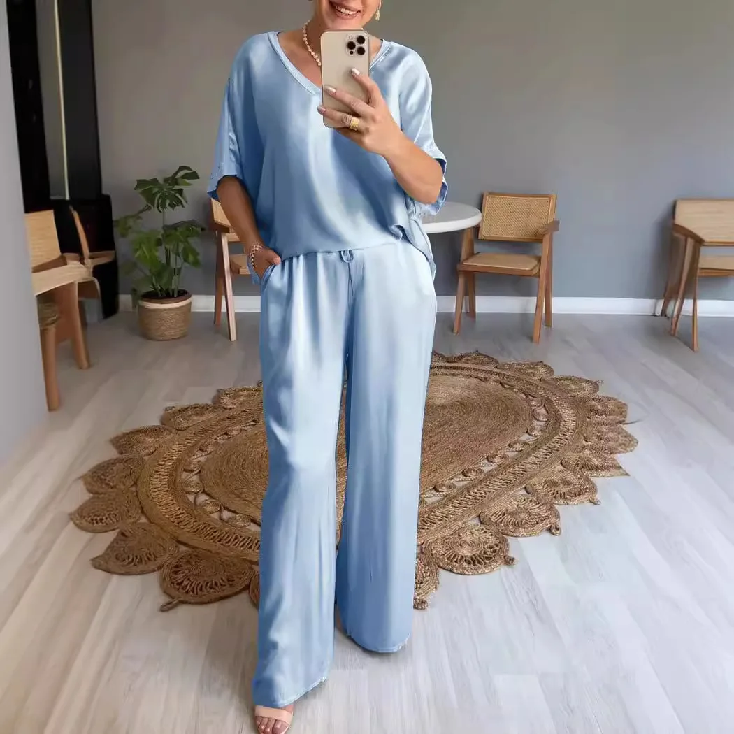 Summer Short-sleeved T-shirt Two-piece Set For Women V-neck Top Pullover Wide-leg Pants Suit For Women Spring Loose Satin Suit
