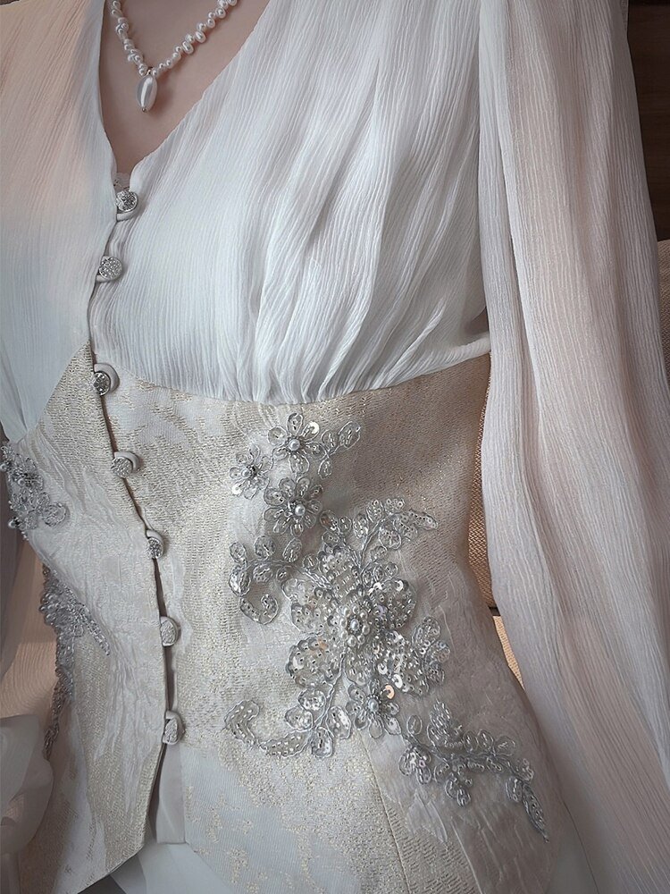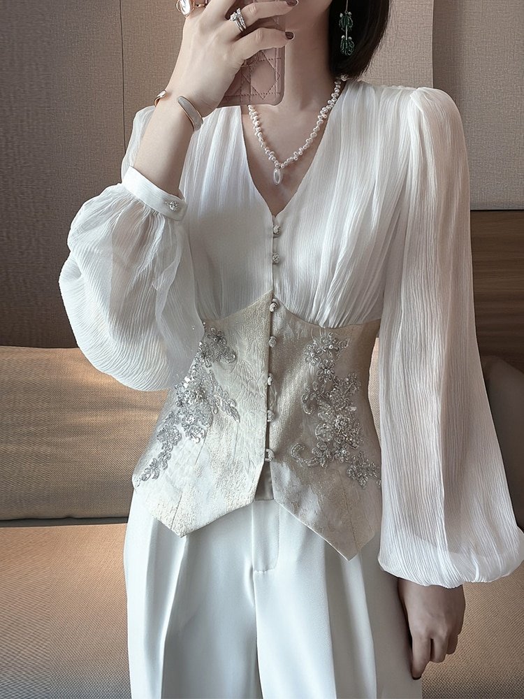 Temperament Laides Tops V-neck Lantern Sleeve Blouses for Women Chic Beading Sequins Vintage Shirts Blusas Mujer De Moda