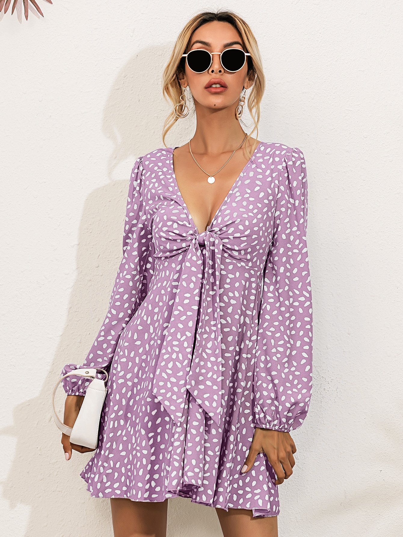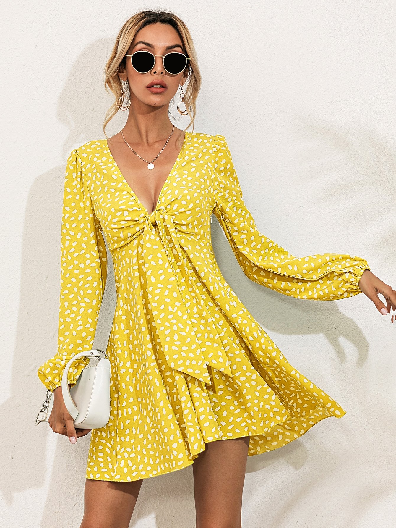 Tie Front All Over Print Vintage Dresses For Women 2022 Elegant A-line V Neck Long Lantern Sleeve High Waist Flared