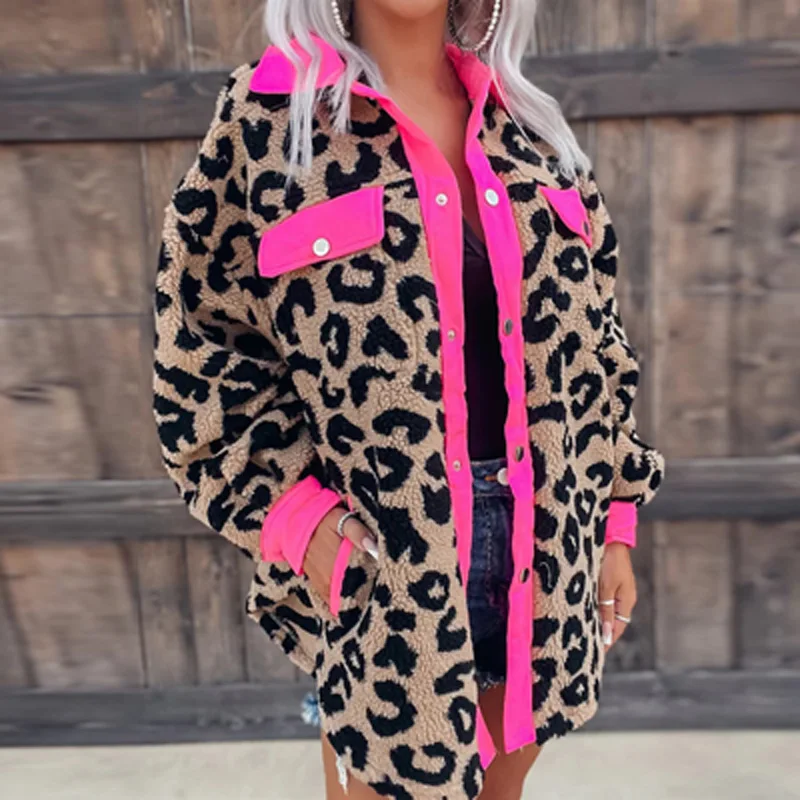 Trend Contrast Color Loose Female Thick Outwear Autumn Winter Retro Button Pocket Coat Casual Women Leopard Print Plush Jacket