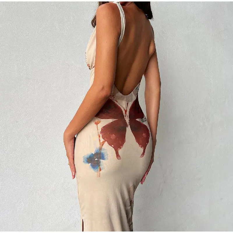 Vintage Print Low-cut Slim Fit Suspended Dress Fashion V-neck Sleeveless Backless Long Frock Summer High Waist Split Party Robes
