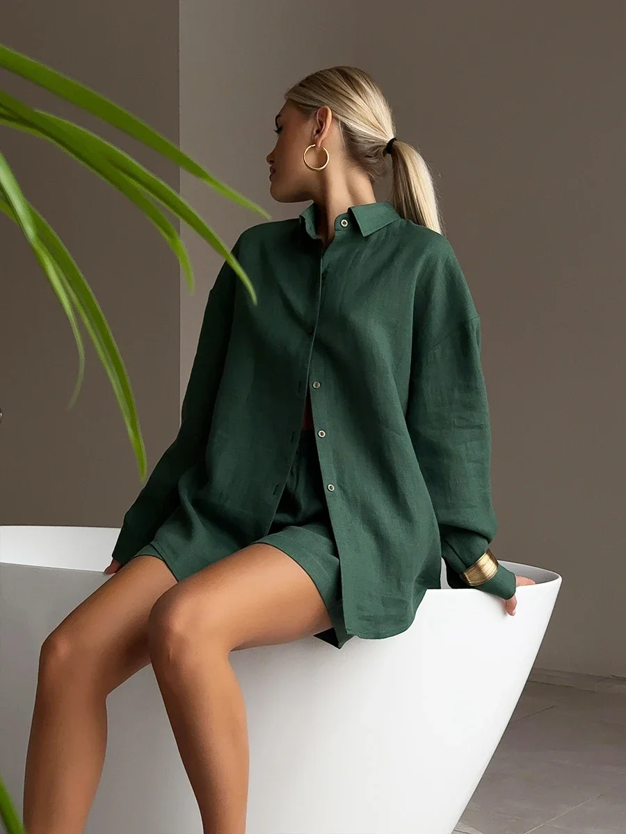 Wolfeel 100% Cotton Women’s Casual Shorts Sets Solid Color Cozy Lapel Long Sleeve Shirt Summer Loose Elastic Waist Shorts Suits