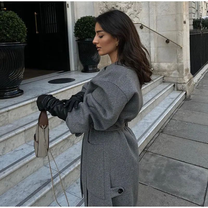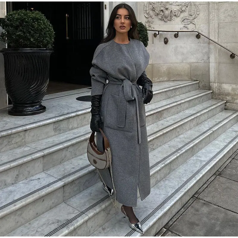 Women Elegant Lace-up Wool Blends Long Coats Autumn Winter Long Sleeve O Neck Overcoat Femael Street Double Pockets Outerwear