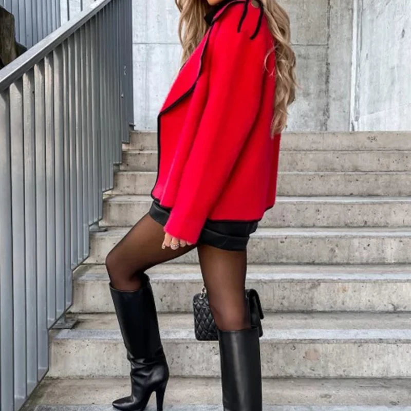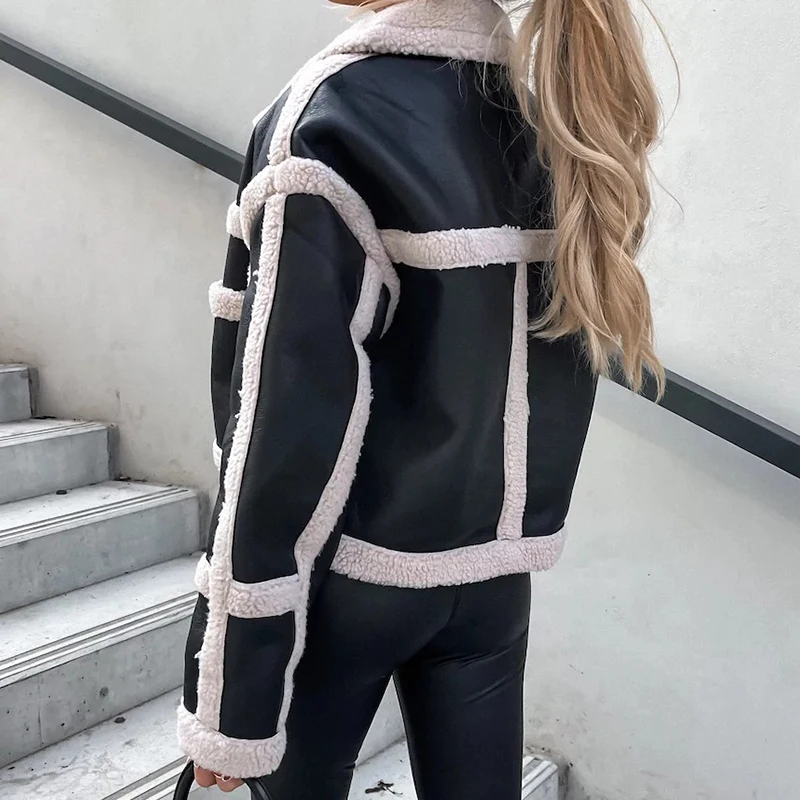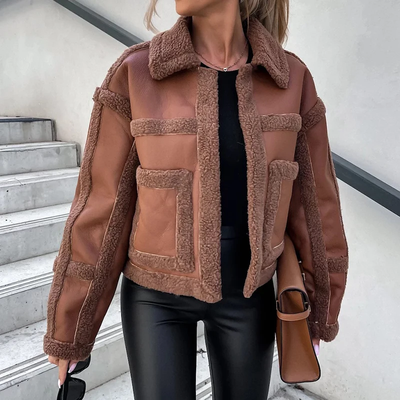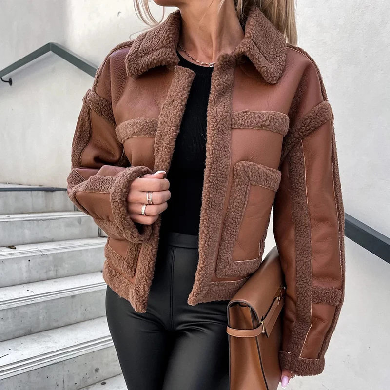 Women Elegant Lamb Wool Leather Stitching Cardigans Fall Casual Long Sleeve Slim Short Jacket Winter Fashion Warm Solid Coat Top