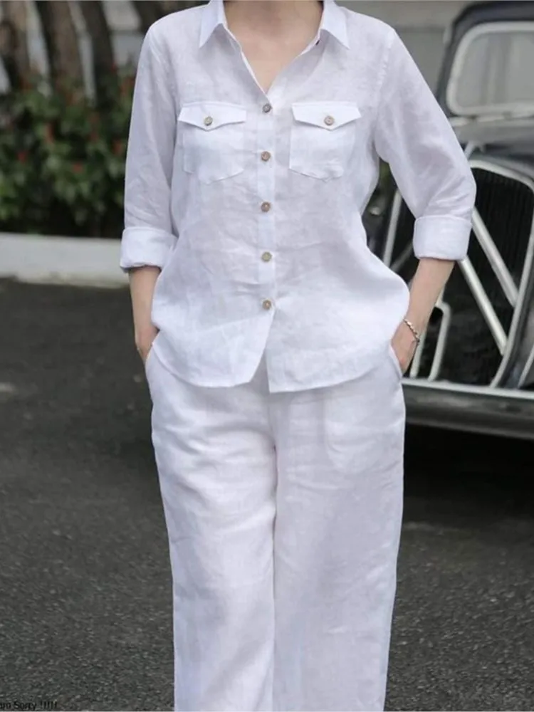 Women Elegant Lapel Neck Long Sleeve Shirt Pants Sets 2PCS Fashion Autumn Outifits Solid Work Trousers Suits Tracksuit