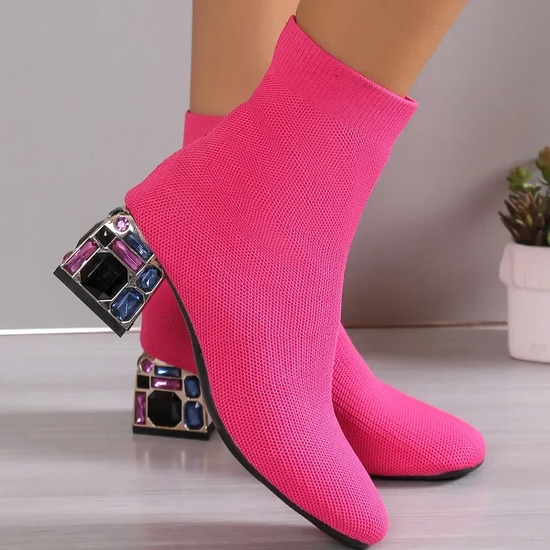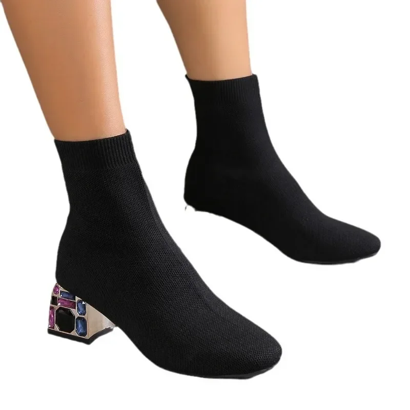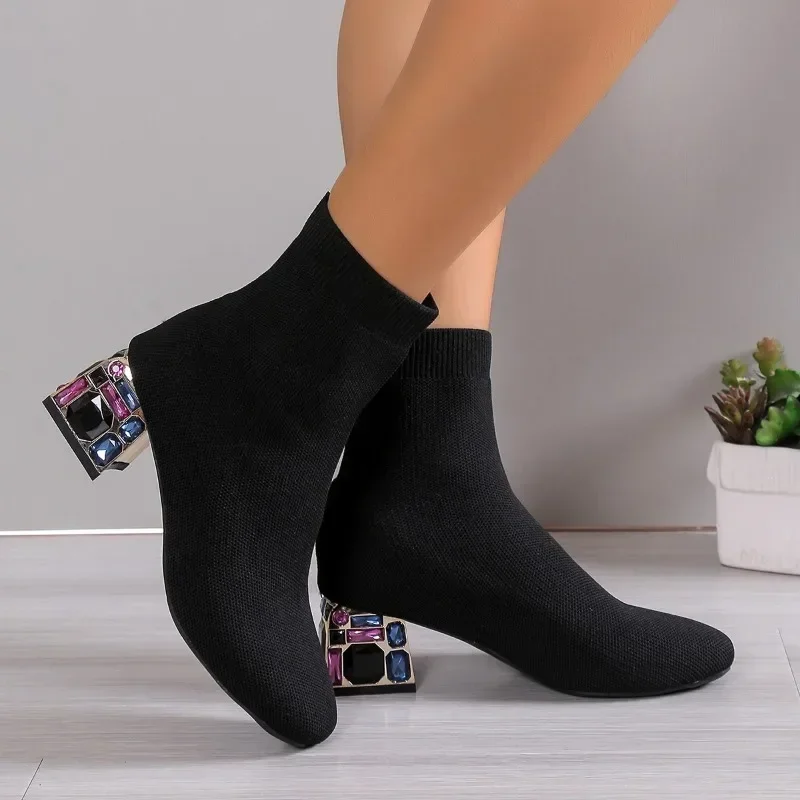 Women Sequin Ankle Boots Winter Round Toe Colorful Rhinestone Square Heels Fashion Elastic Short Sock Boots Retro Banquet Shoes