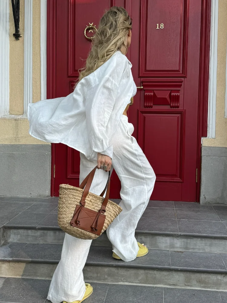 Women Solid Cotton Loose Pants Set Casual Single Breasted Full Sleeve Tops Suits Summer Casual Lady New Vocation Beach Outfit