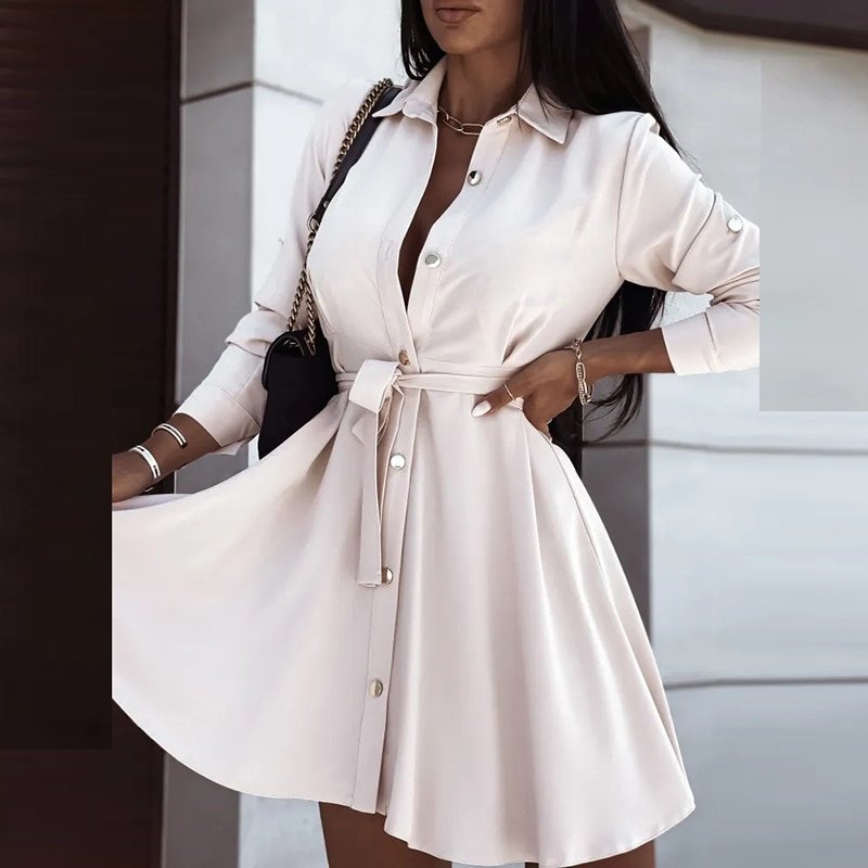 Women Vintage Front Button Sashes A-line Party Dress Long Sleeve Turn Down Collar Solid Elegant Dress Autumn Fashion Dress