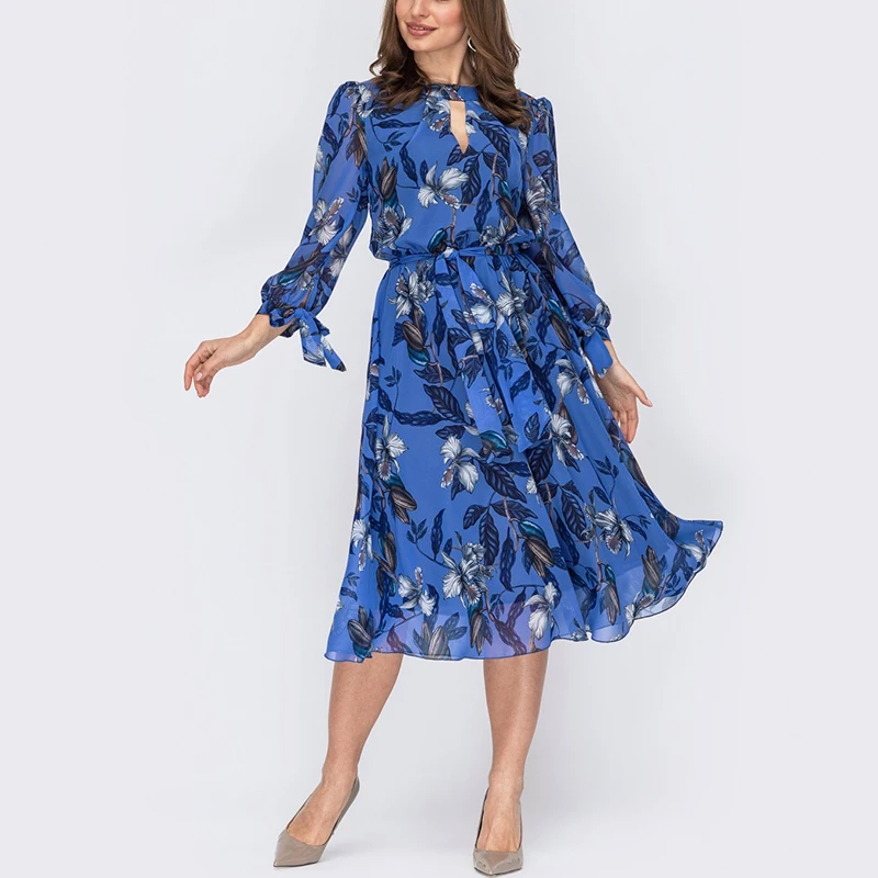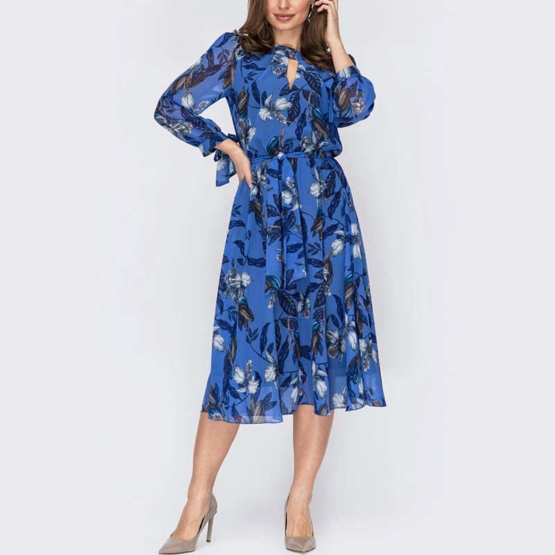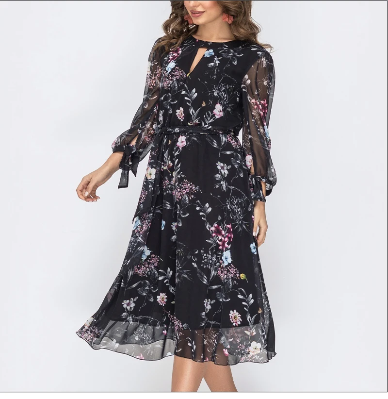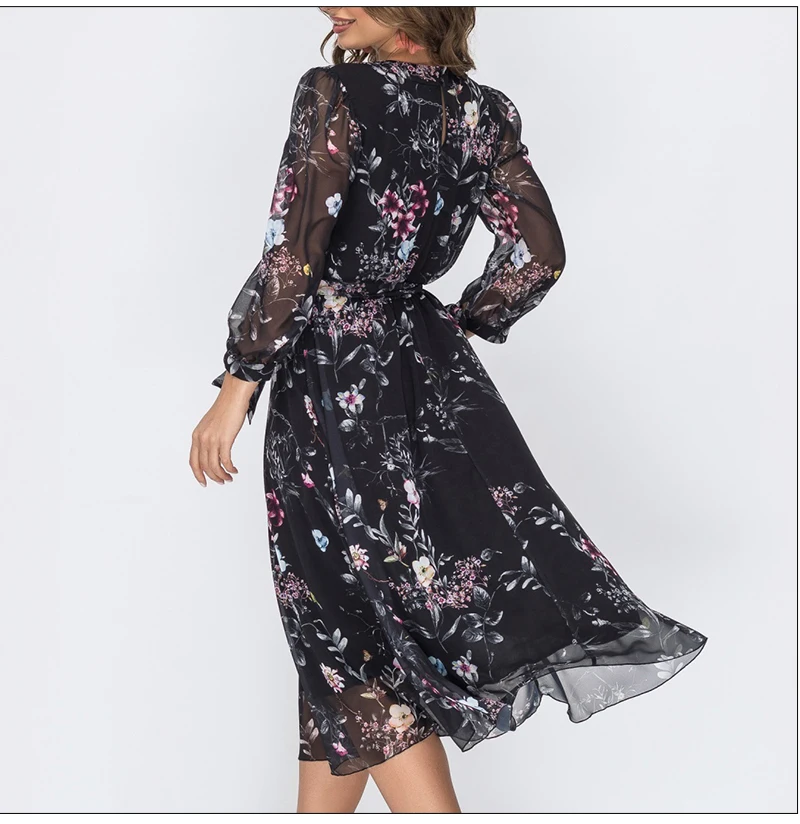 Women’s Bohemian Flower Print Mini Dresses Spring Summer O-neck Long Sleeve Casual Chiffon Vestidos De