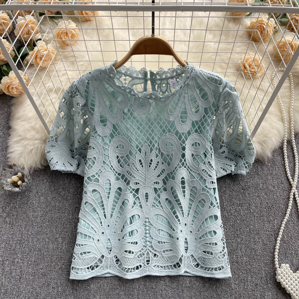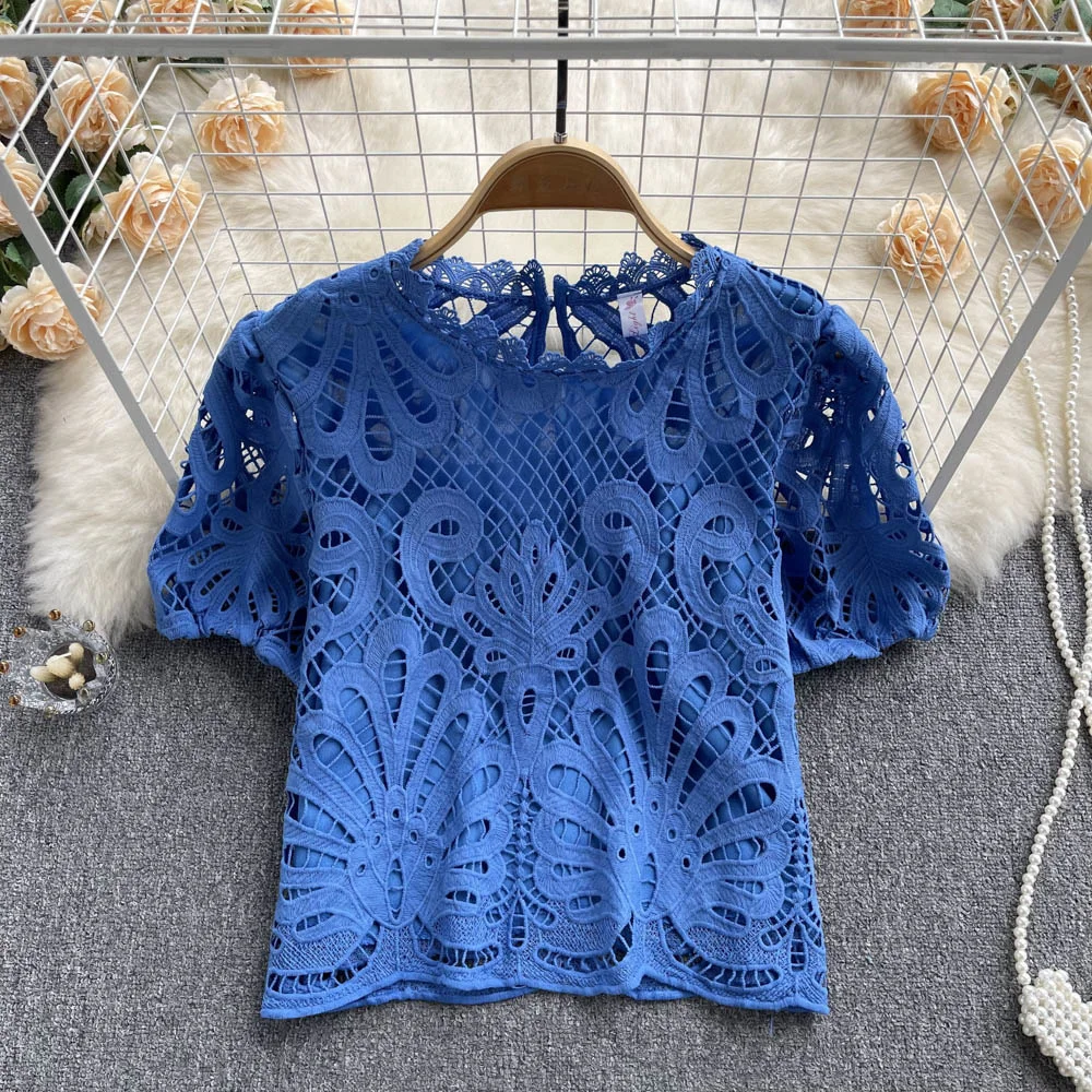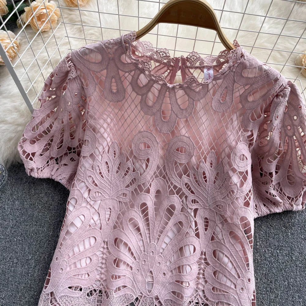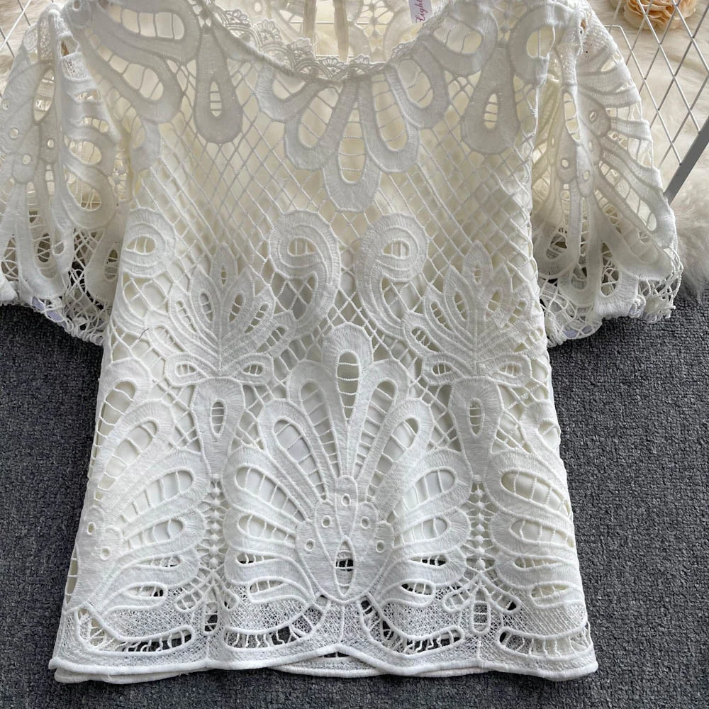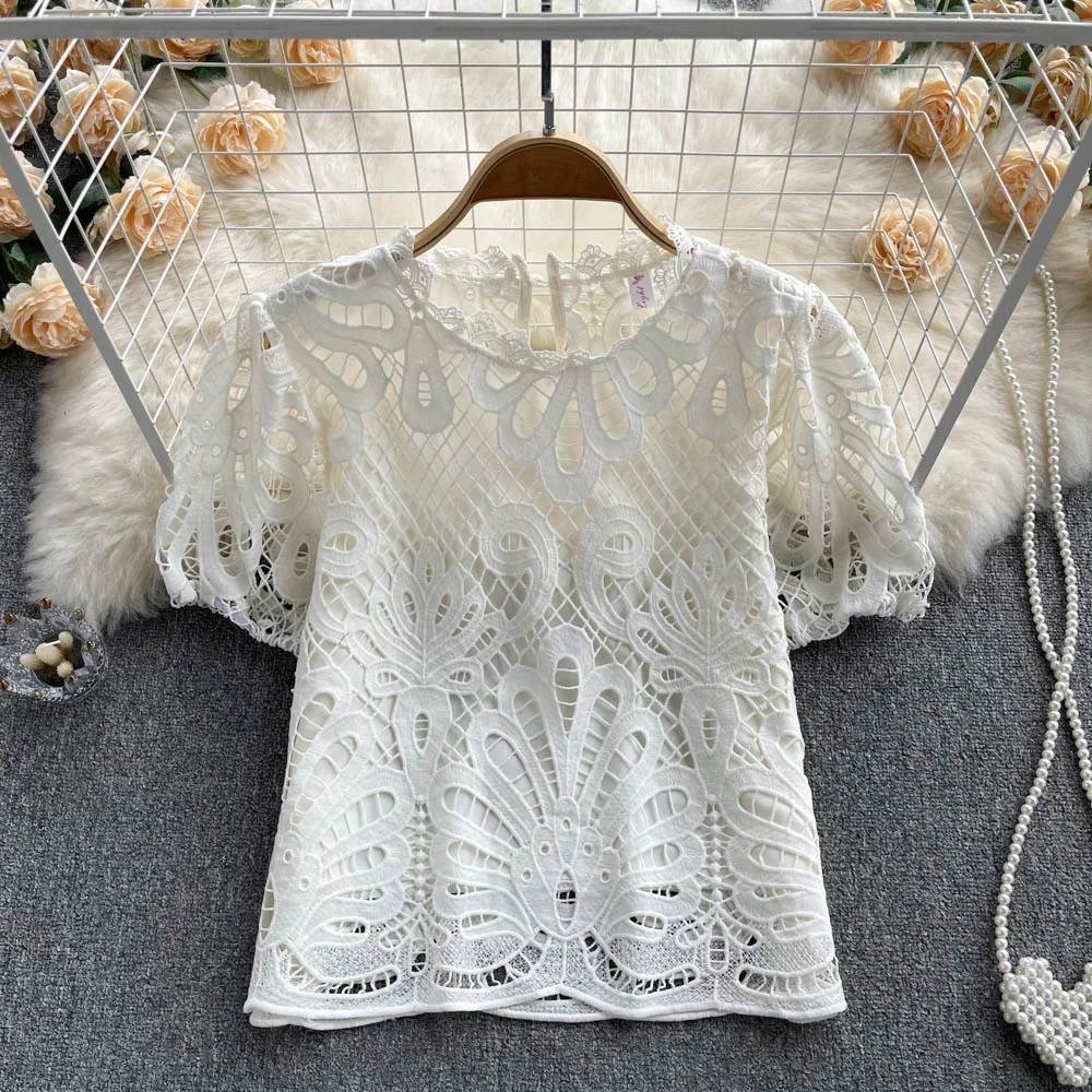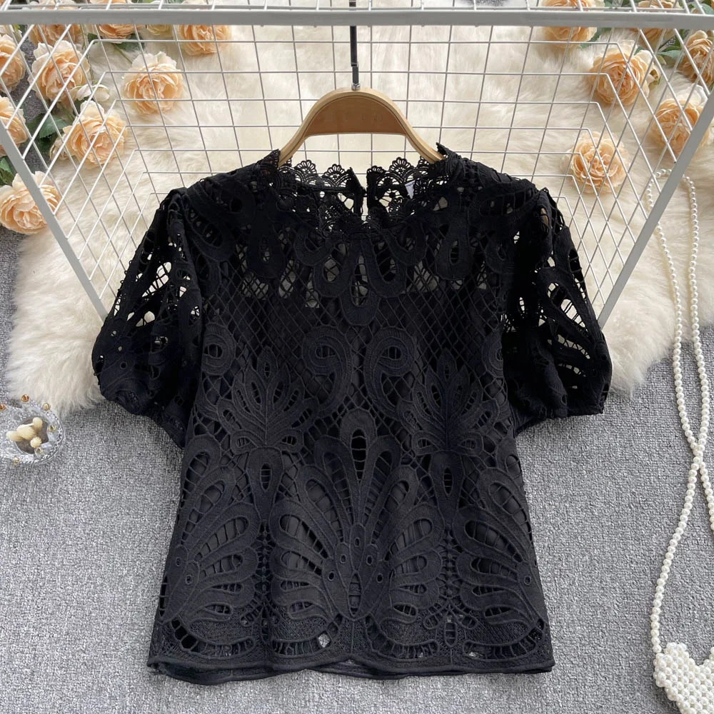 Women’s Lace top female hollow out temperament puff sleeve loose Slim Clothing Sweet Korea Chic Girl’s Summer
