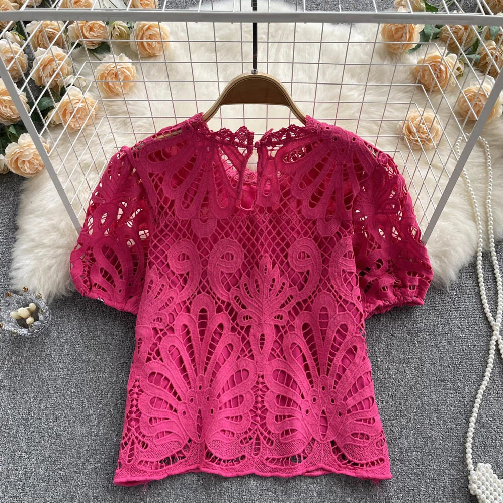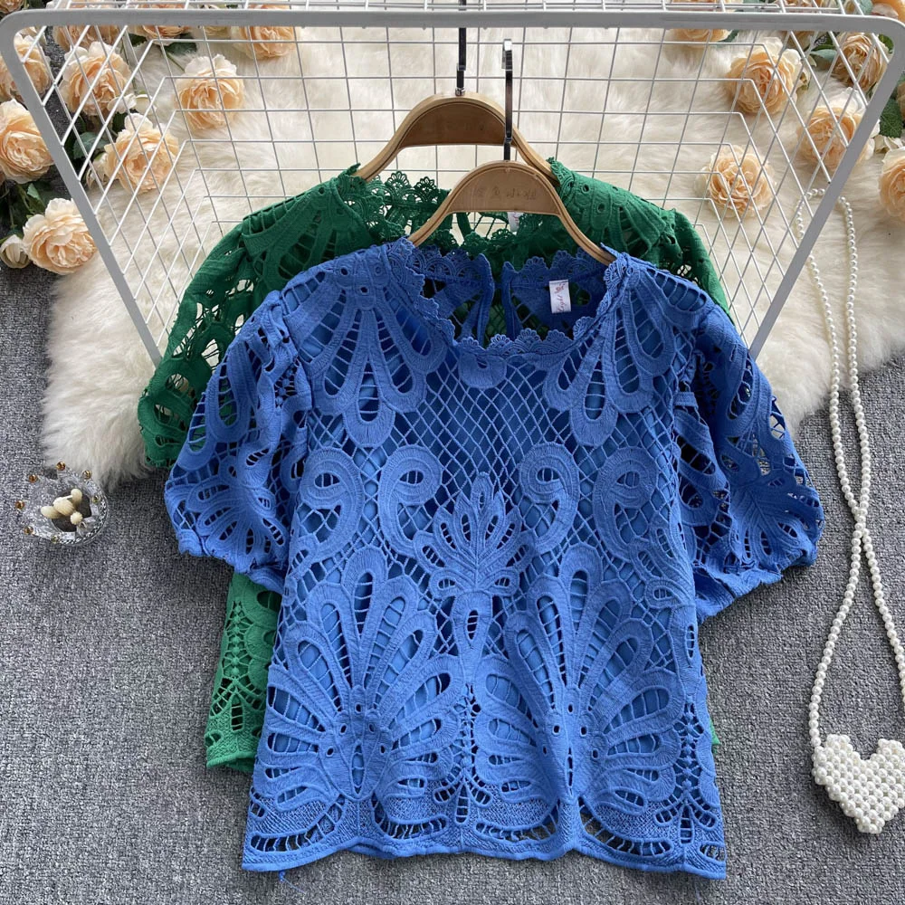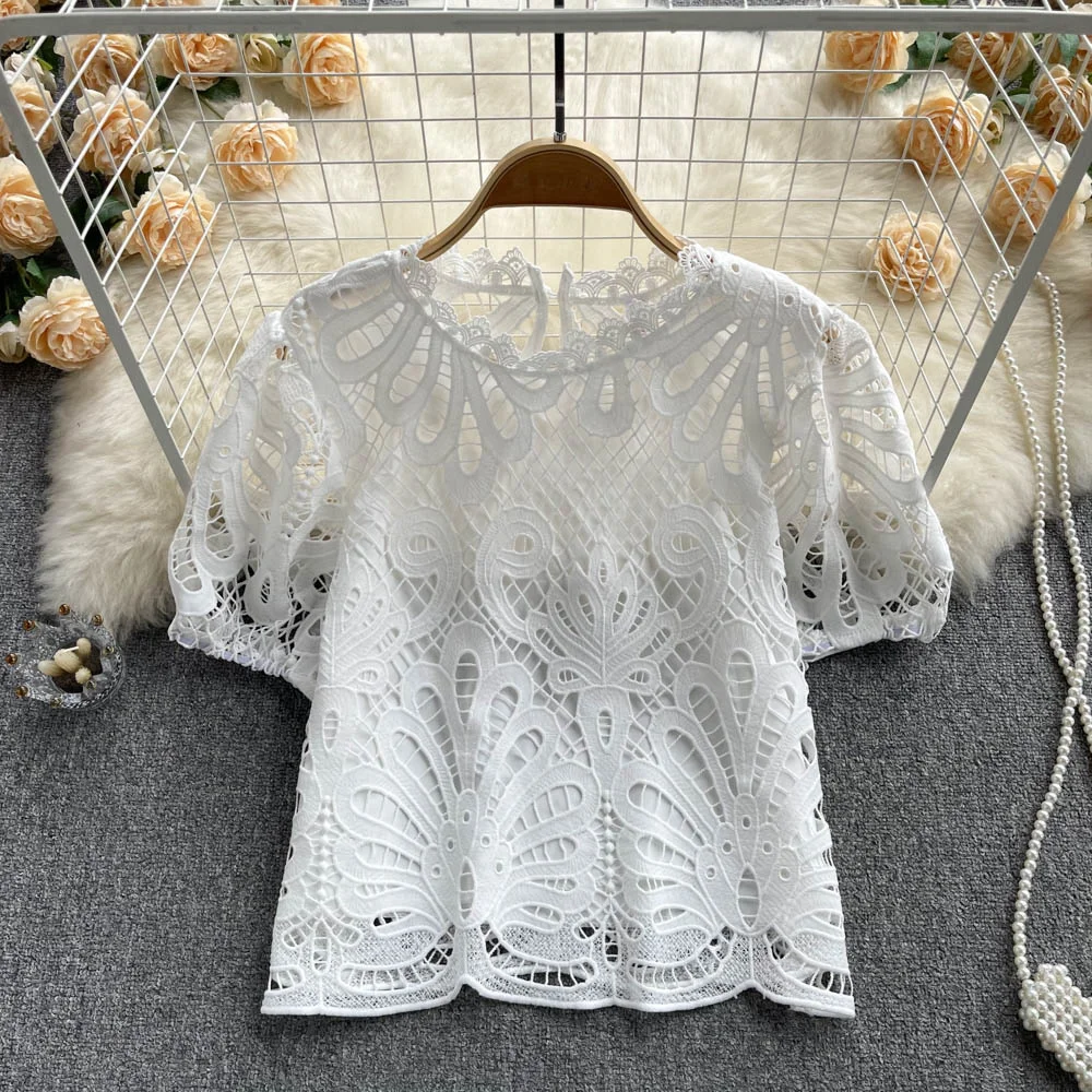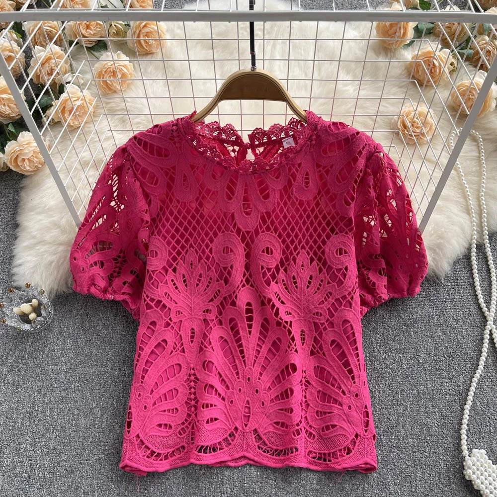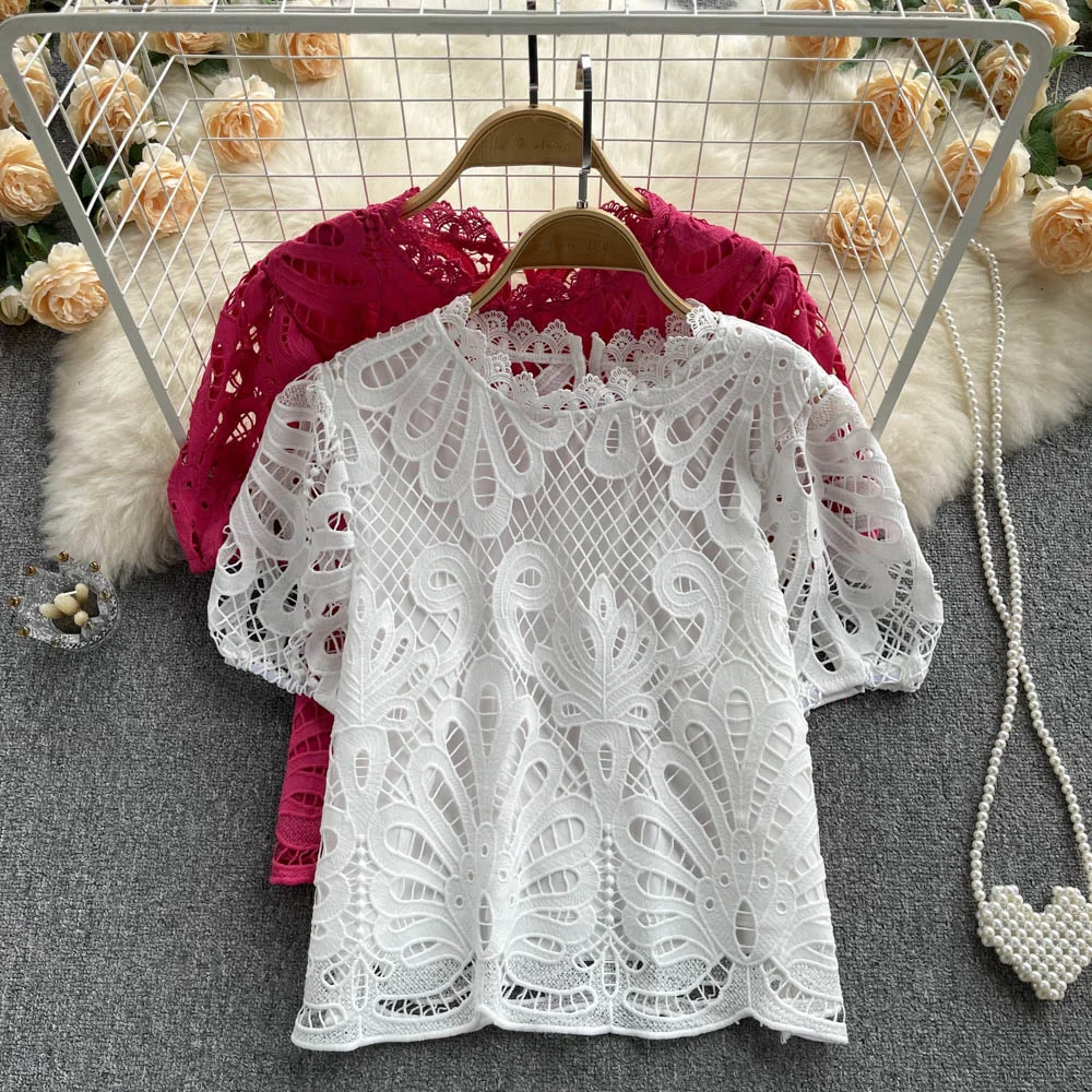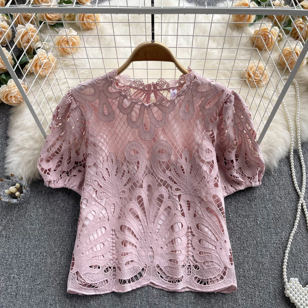 Women’s Lace top female hollow out temperament puff sleeve loose Slim Clothing Sweet Korea Chic Girl’s Summer