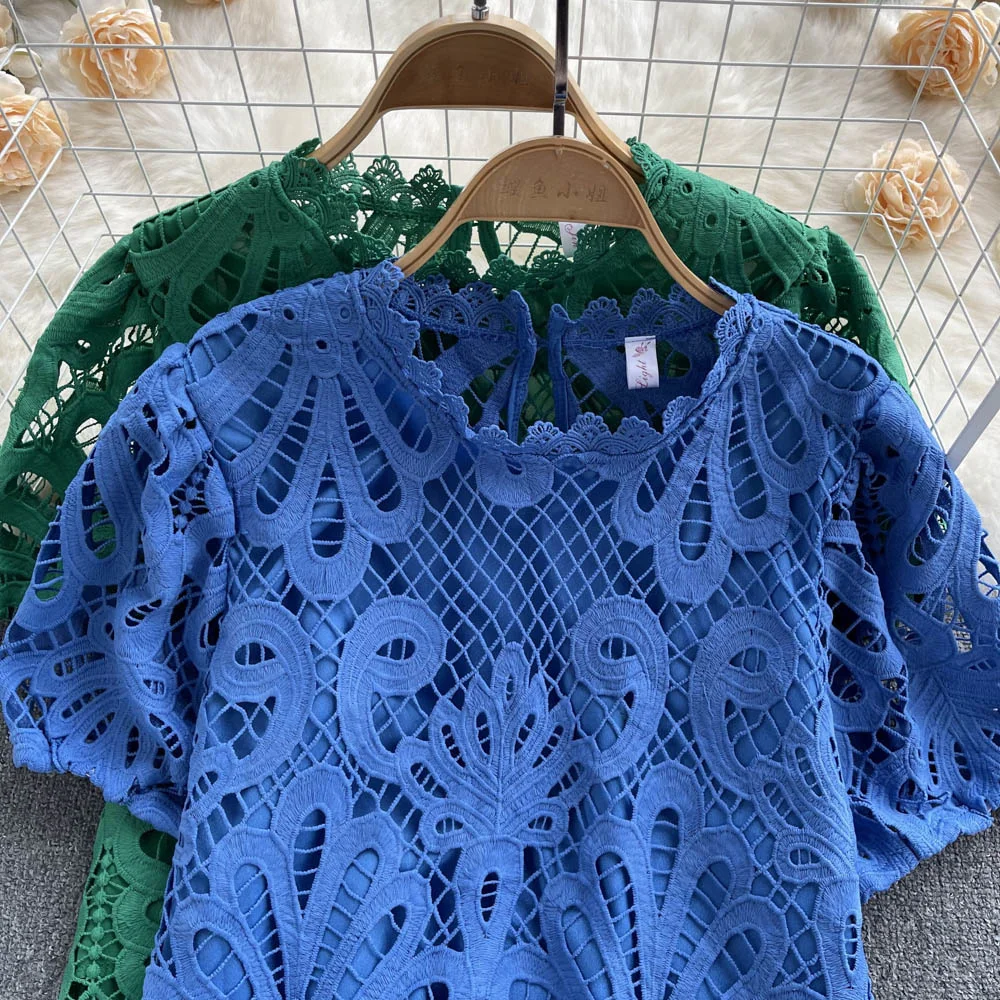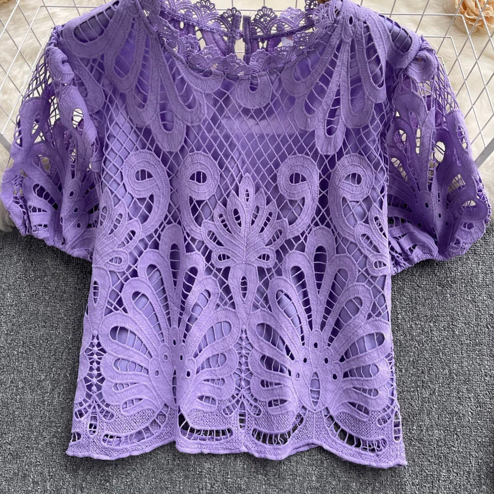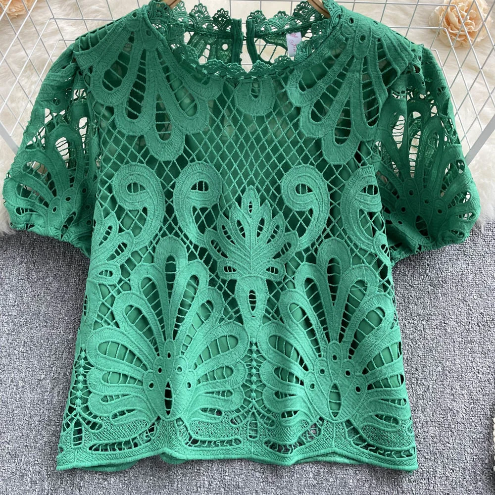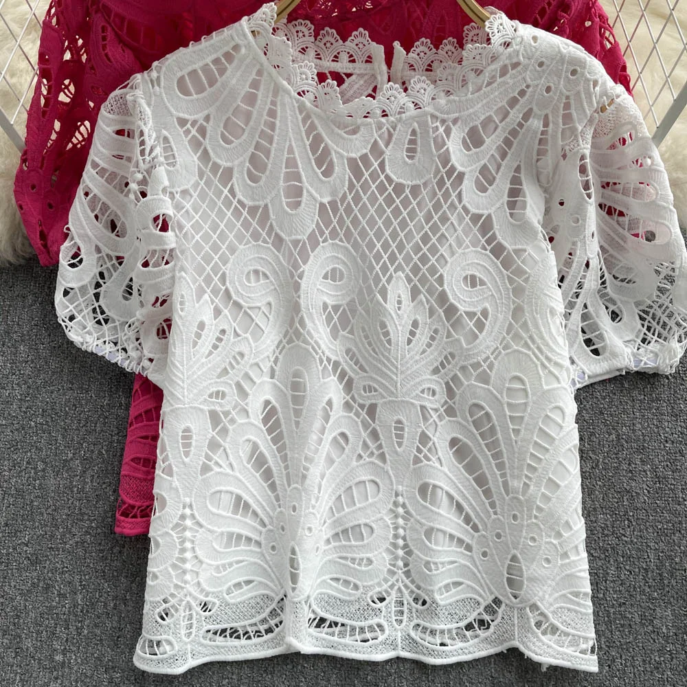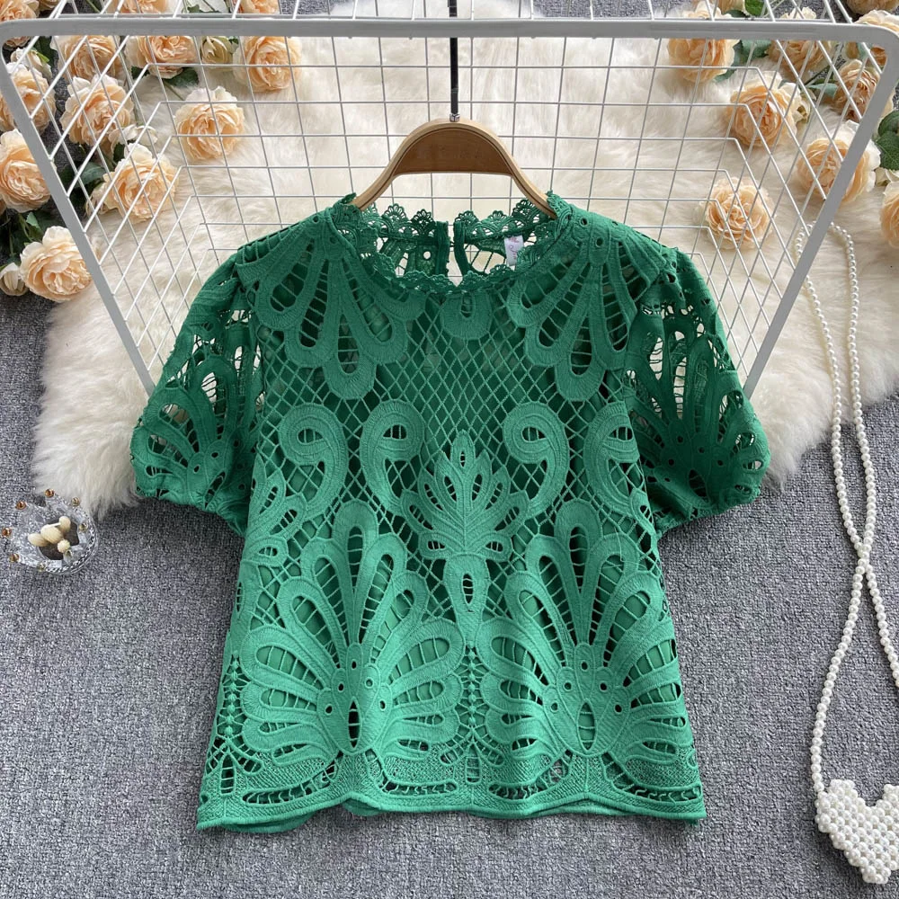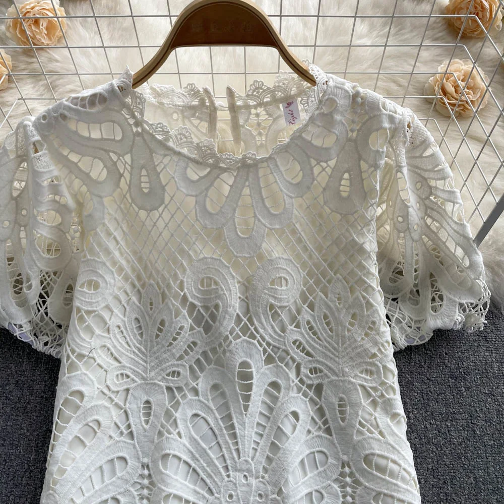 Women’s Lace top female hollow out temperament puff sleeve loose Slim Clothing Sweet Korea Chic Girl’s Summer