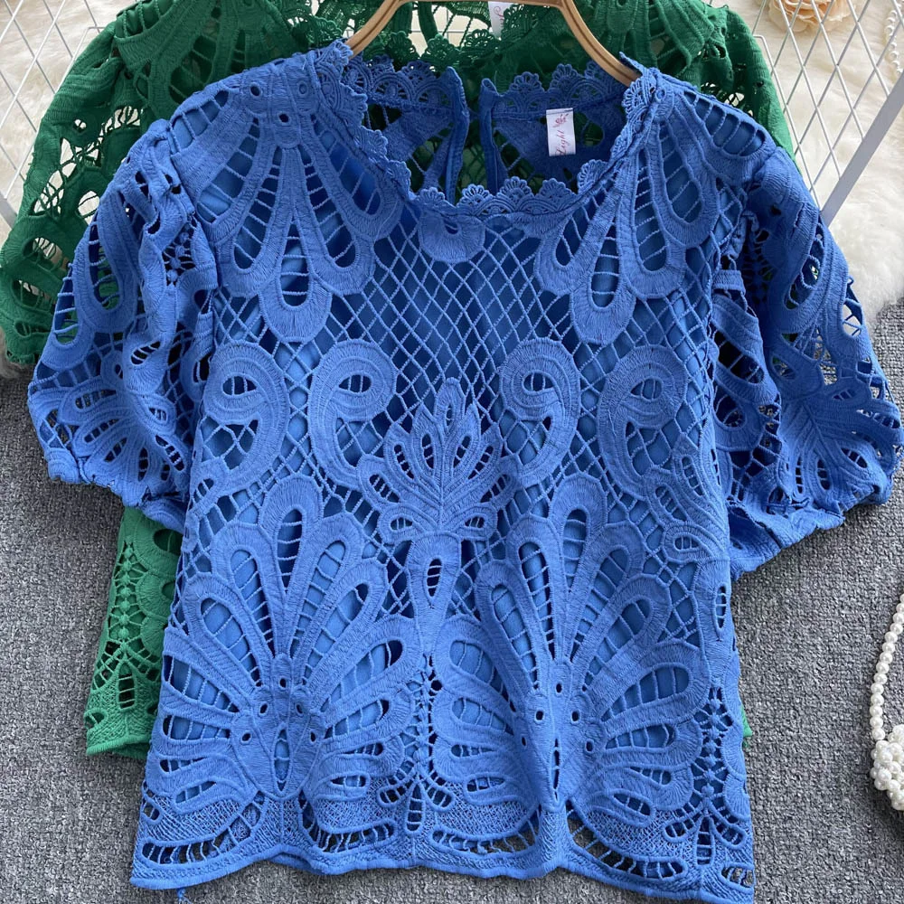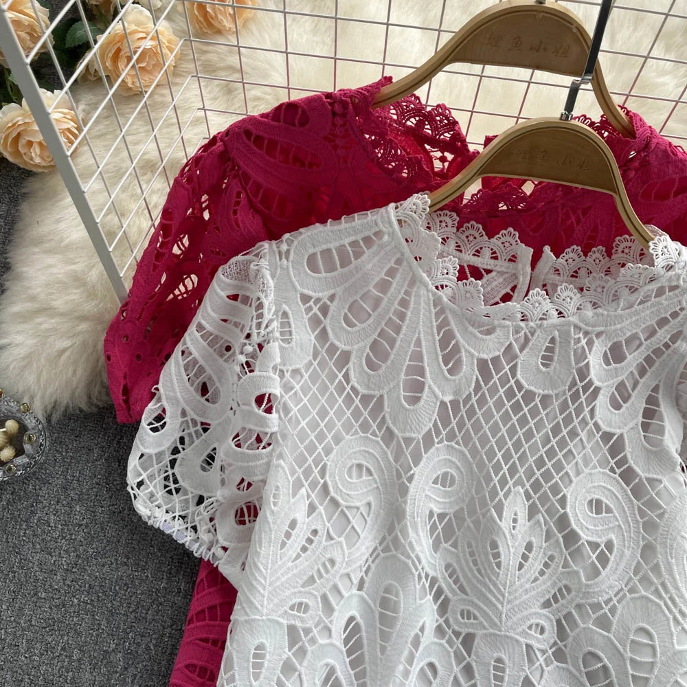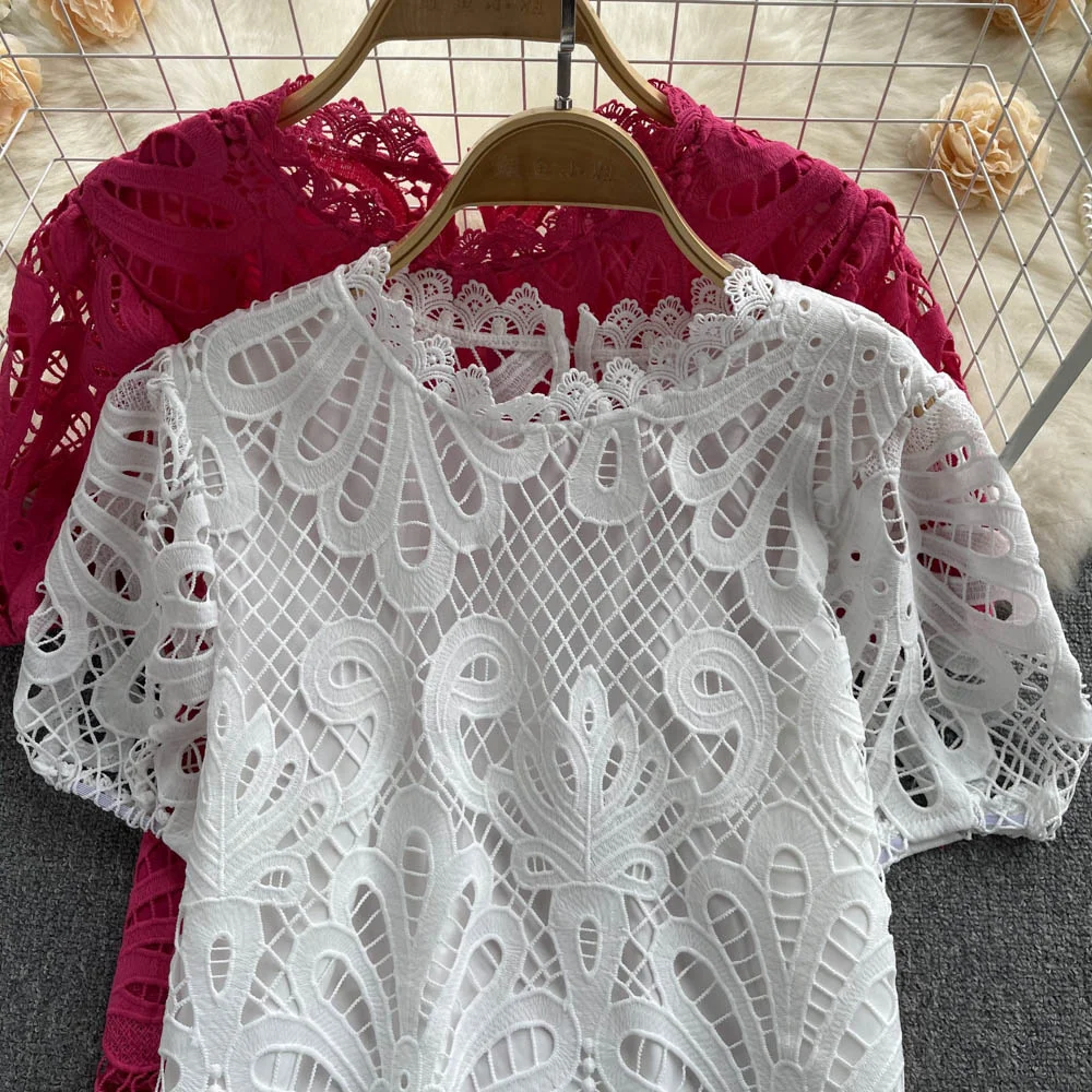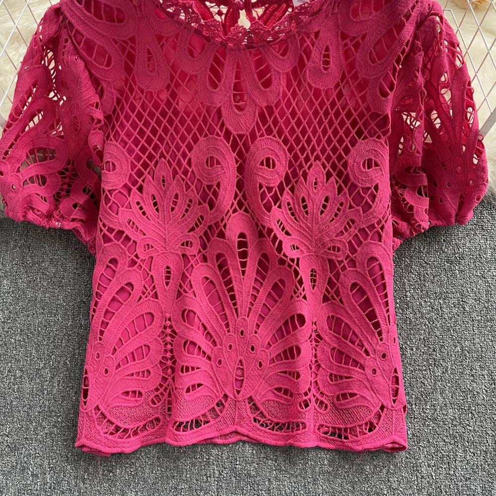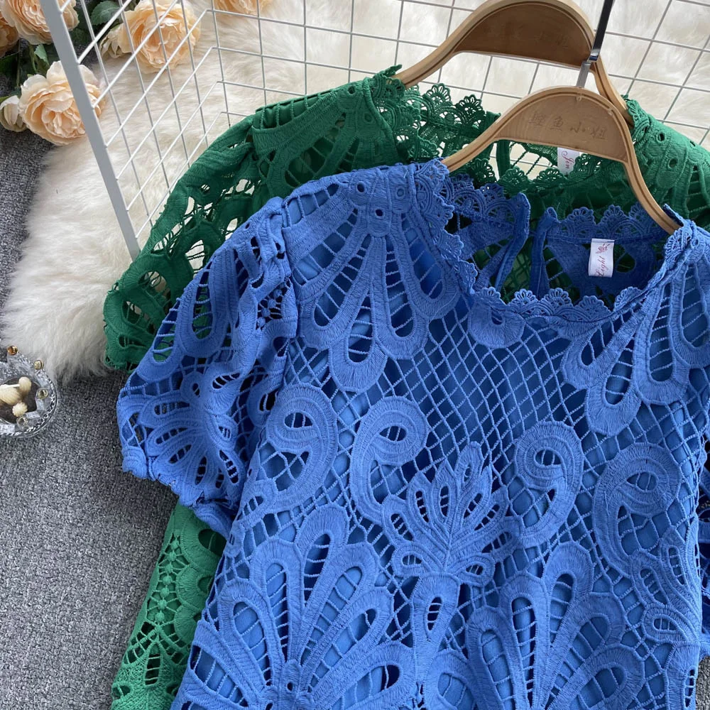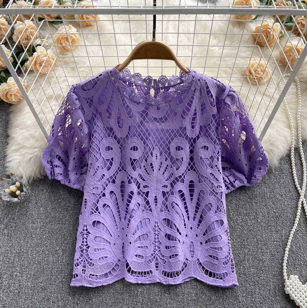 Women’s Lace top female hollow out temperament puff sleeve loose Slim Clothing Sweet Korea Chic Girl’s Summer