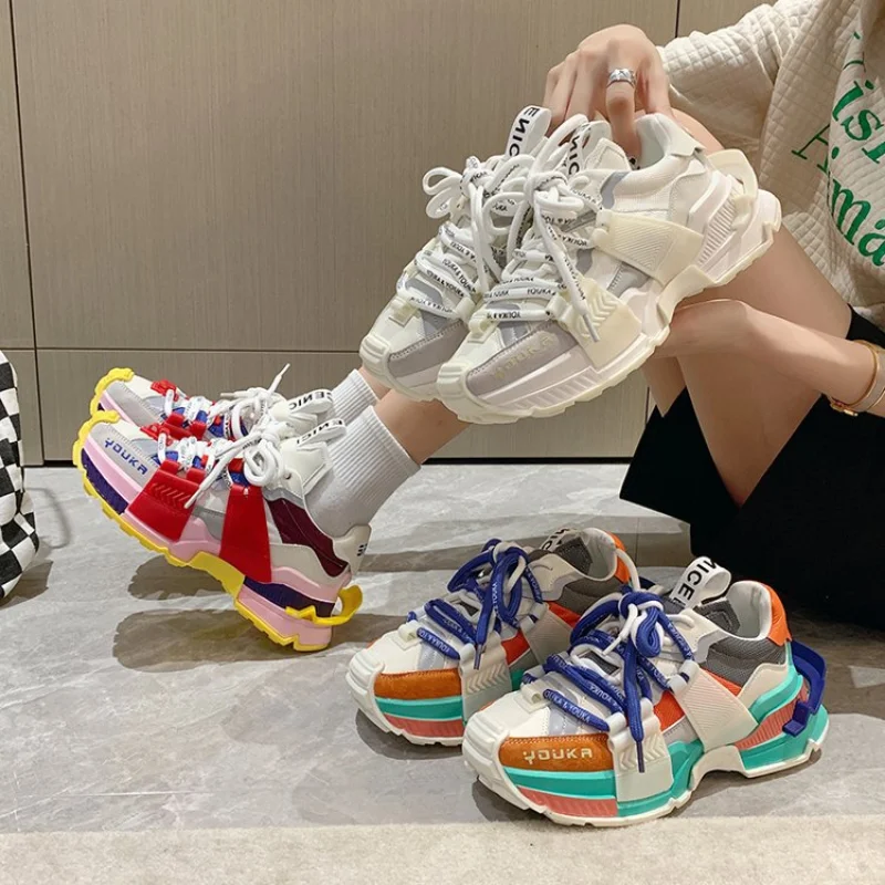 Women’s Shoes New Color Matching Design Thick Bottom Breathable Rainbow Contrast Color Heightening Casual Women Sneakers Tenis