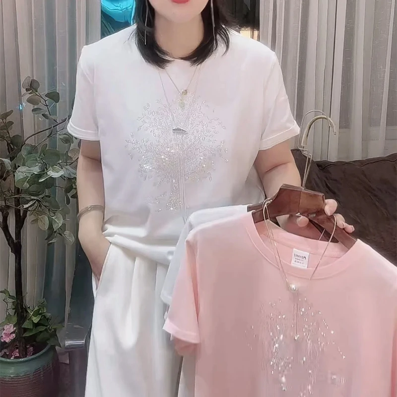 Be the first to review “Women’s Summer New Fashion Commute Cotton Round Neck Diamonds Printed Solid Color Loose Short Sleeve Casual T-shirts Tops”