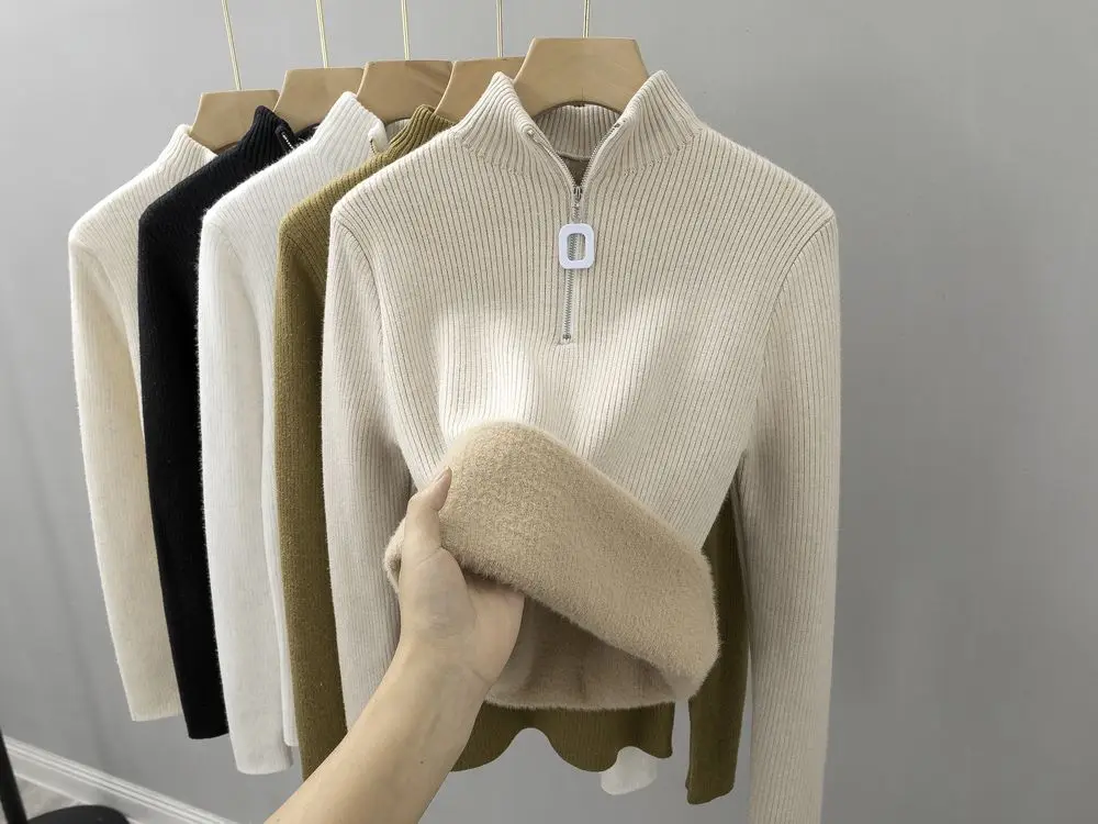 Zipper Half Turtleneck Sweater Women Plush Thickened Long Sleeve Knitwear Black Underlay Winter Warm Top Solid Jumper